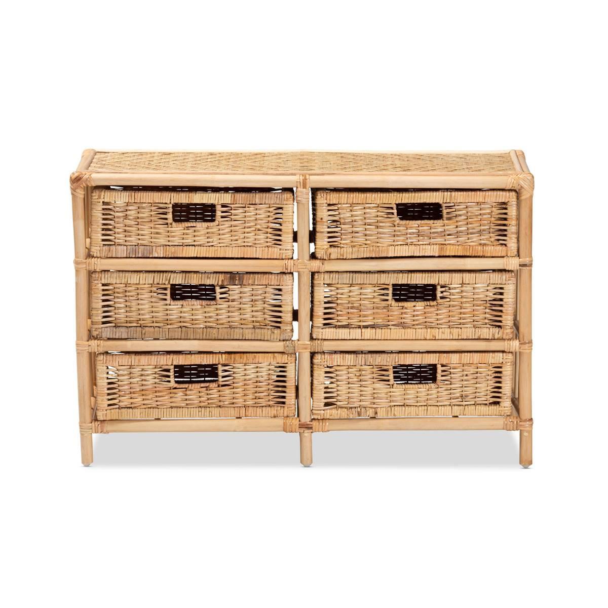 Upgrade the storage potential of your home while adding an exotic touch of warmth with the Baxton Studio Dariana storage cabinet. Made in Indonesia, this handy addition is comprised of natural rattan. Six drawers offer space to organize household essentials, while the woven rattan tabletop serves as an eye-catching pedestal for decorations. The Dariana will arrive fully assembled and features cut-out drawer handles that complement the openwork frame of the piece. With a petite yet versatile design, the Dariana storage cabinet is sure to make an impact on any room layout.