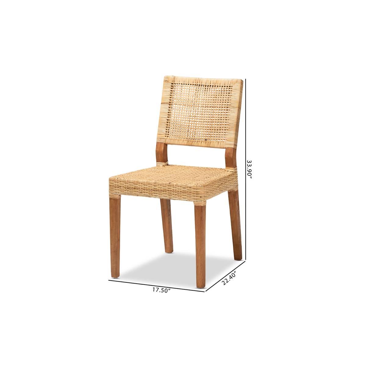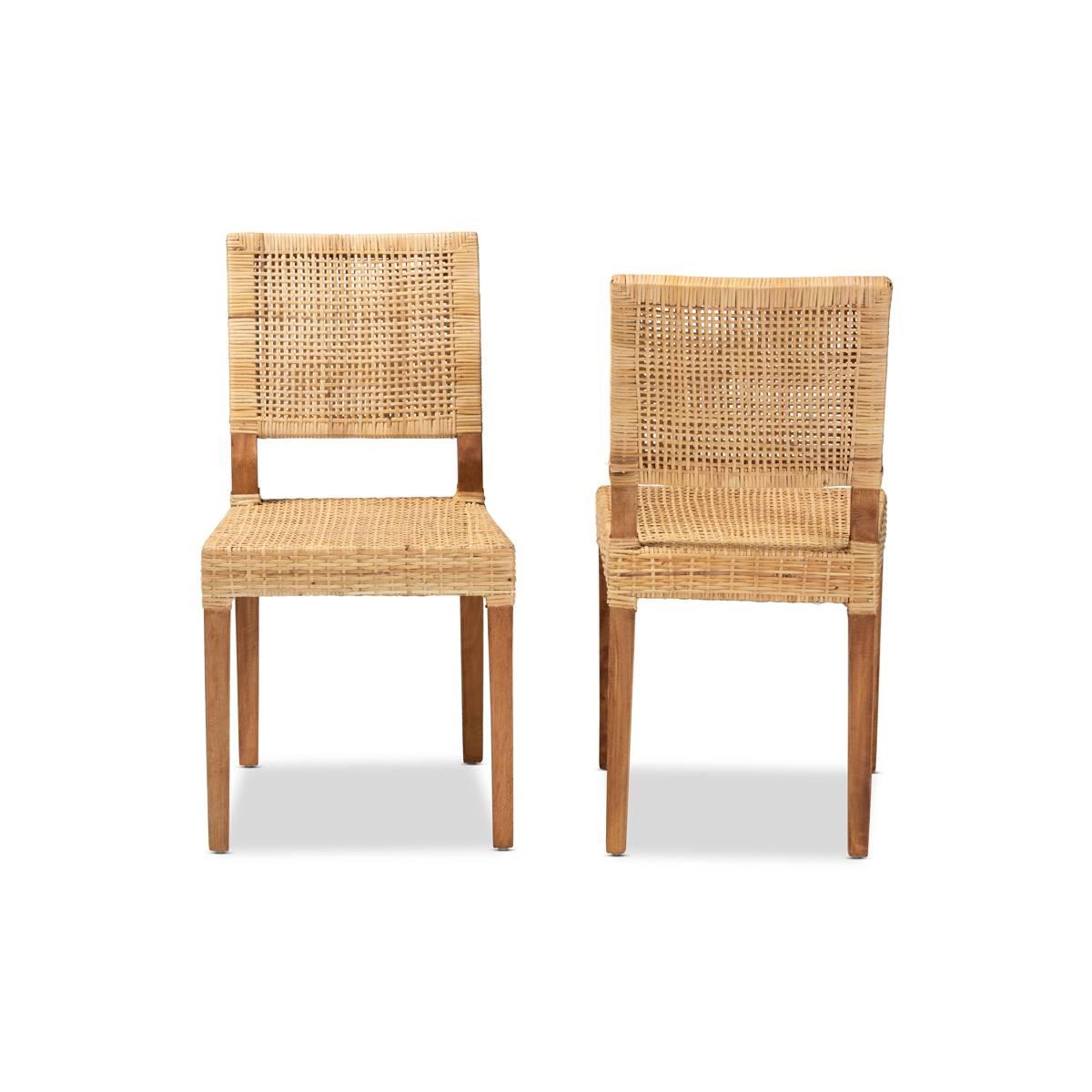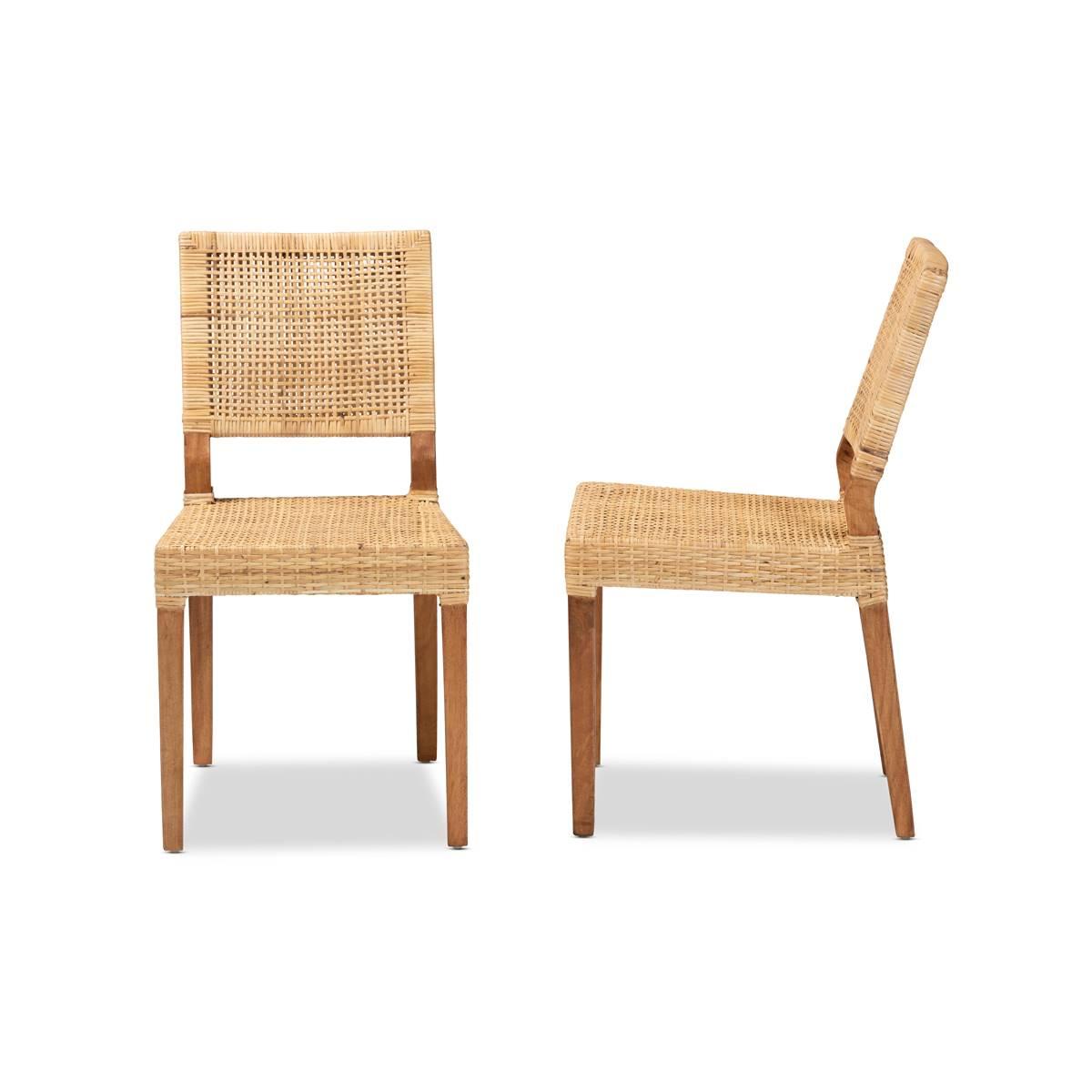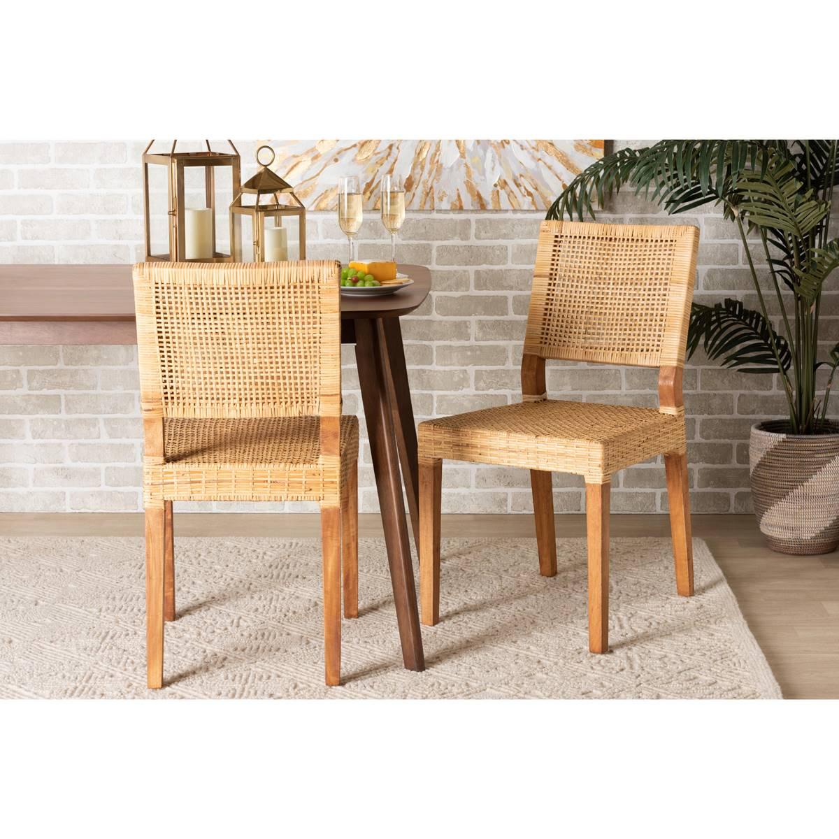 Fashion a cherished arrangement for every meal with the delightful Baxton Studio Lesia dining chair. Made in Indonesia, this chair is comprised of a study mango wood frame wrapped in natural rattan. The square backrest forms a crisp silhouette, while woven detailing highlights the intricate craftsmanship of the piece. The Lesia will arrive fully assembled and features an angled backrest and legs for stable yet cozy support. Perfect for indulging with friends and family, the Lesia dining chair elevates any occasion.