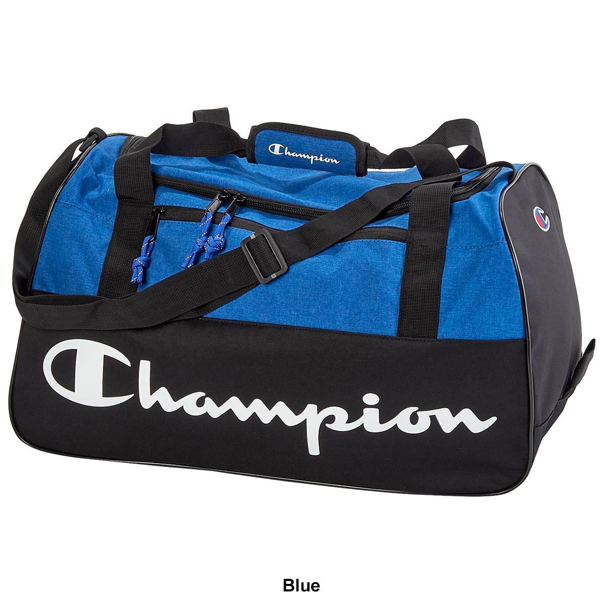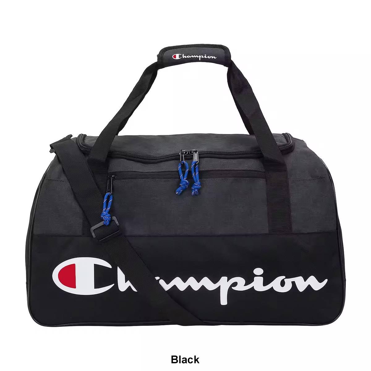 Whether it´s a full-on practice, a day at the office or long weekend, the Champion® utility duffel bag gives you all the room you need. Sturdy polyester outer shell with tonal logo lining. Toploading bag with inner zip pocket keeps you organized. Low profile side zip pocket and side mesh side pocket hold small items. Sturdy removable web shoulder strap, wrapped top handles and side locker loop for grab and go convenience. Piping along the bottom and sides for a classic, structured gym bag that holds its shape. Champion high density print and embroidered logos for authentic sport style.