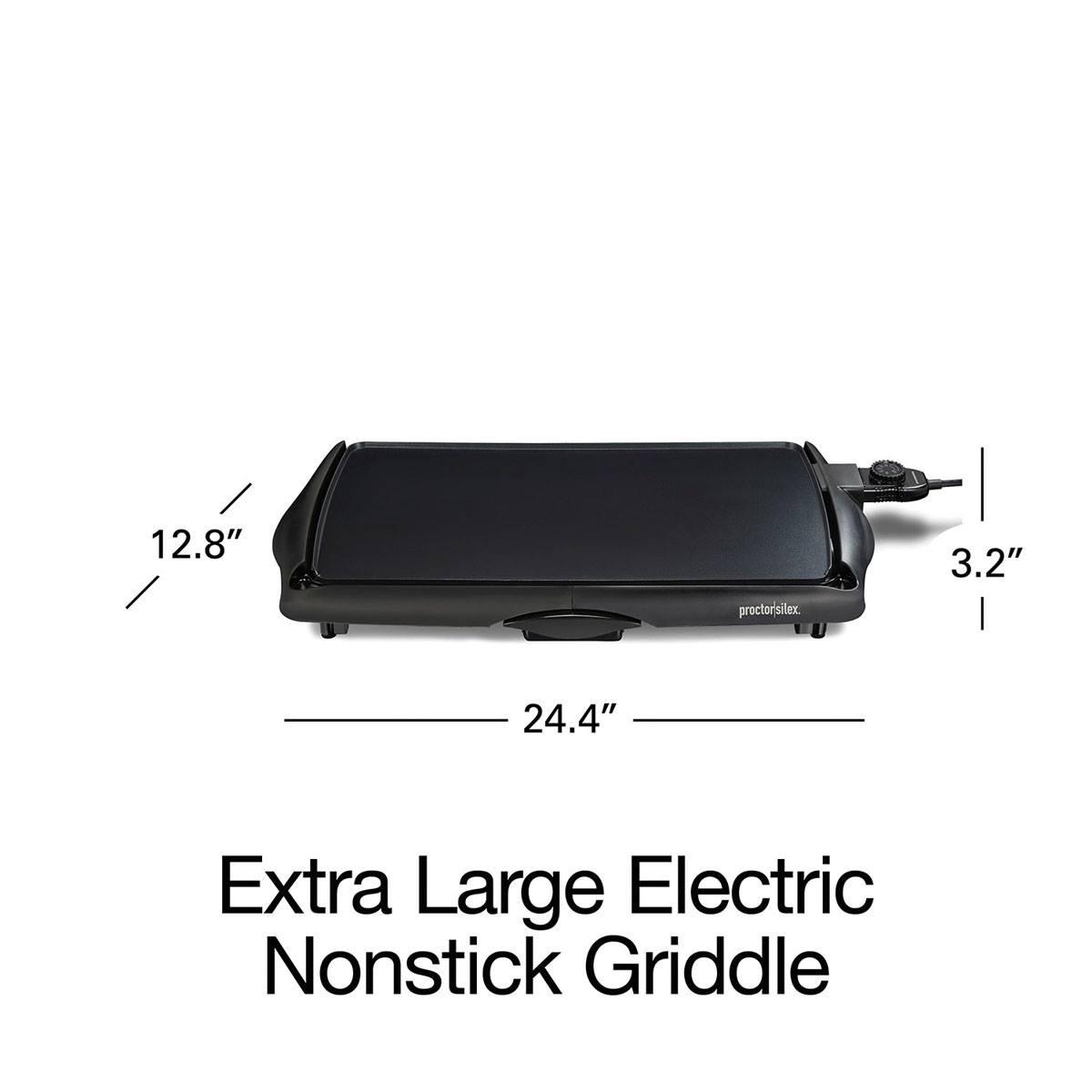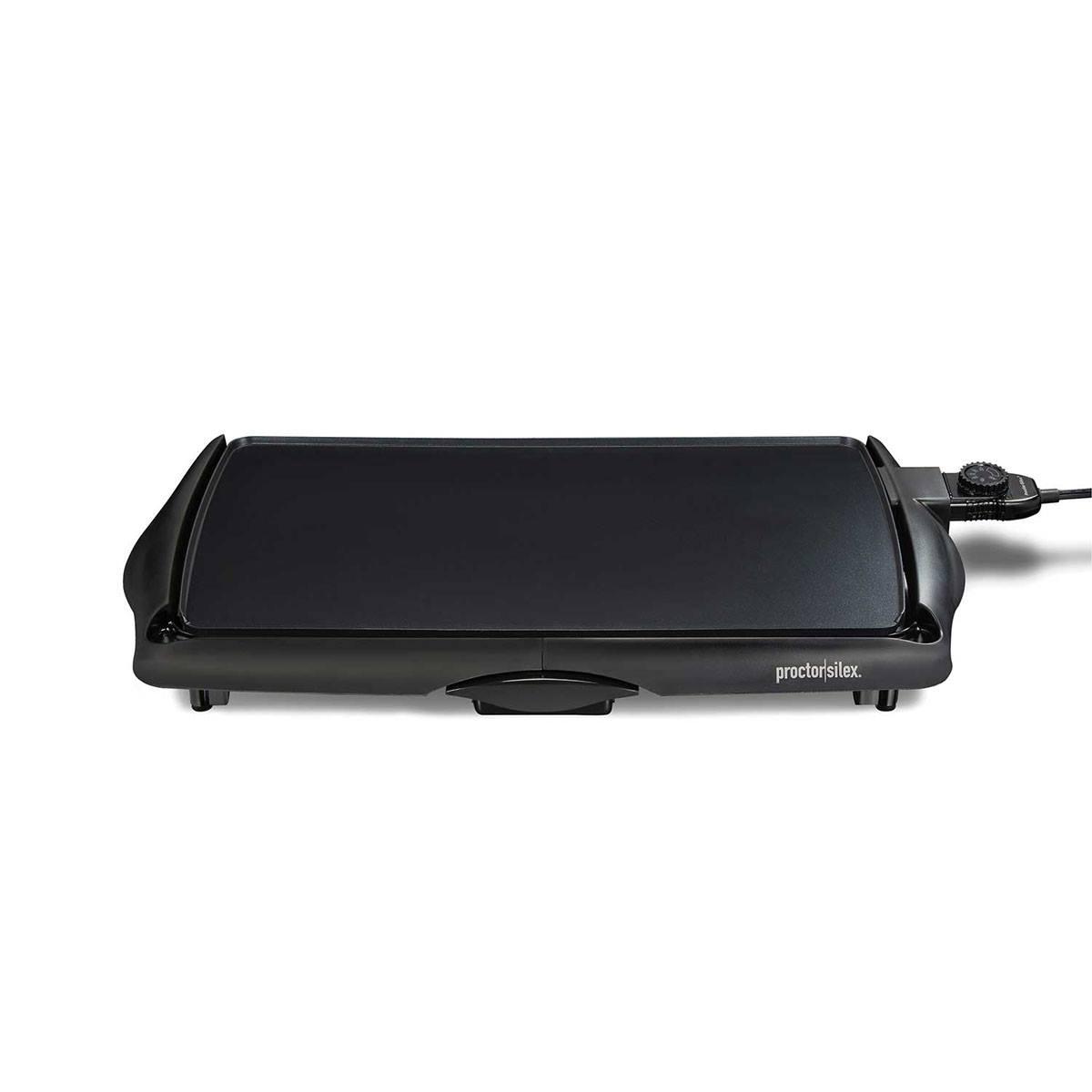 Whether you´re cooking dinner for a hungry family or breakfast for a crowd, the Proctor Silex® Electric Griddle will help you get the job done faster with 200 square inches of nonstick cooking surface. The nonstick surface is easy to wipe clean, and the griddle is fully immersible with the cord removed. Whether you´re frying eggs and bacon, cooking hamburgers, or toasting buns, you can easily adjust the temperature on the electric griddle from 200-400 degrees with the turn of the dial. The built-in handles make it easy to move the large electric griddle. The handles remain cool to the touch while you´re cooking on the griddle. The tray is simple to remove to clean and is dishwasher safe. You never have to guess when the griddle has reached the desired temperature. The indicator light goes out when the set temperature is reached, so you know it´s time to start cooking.