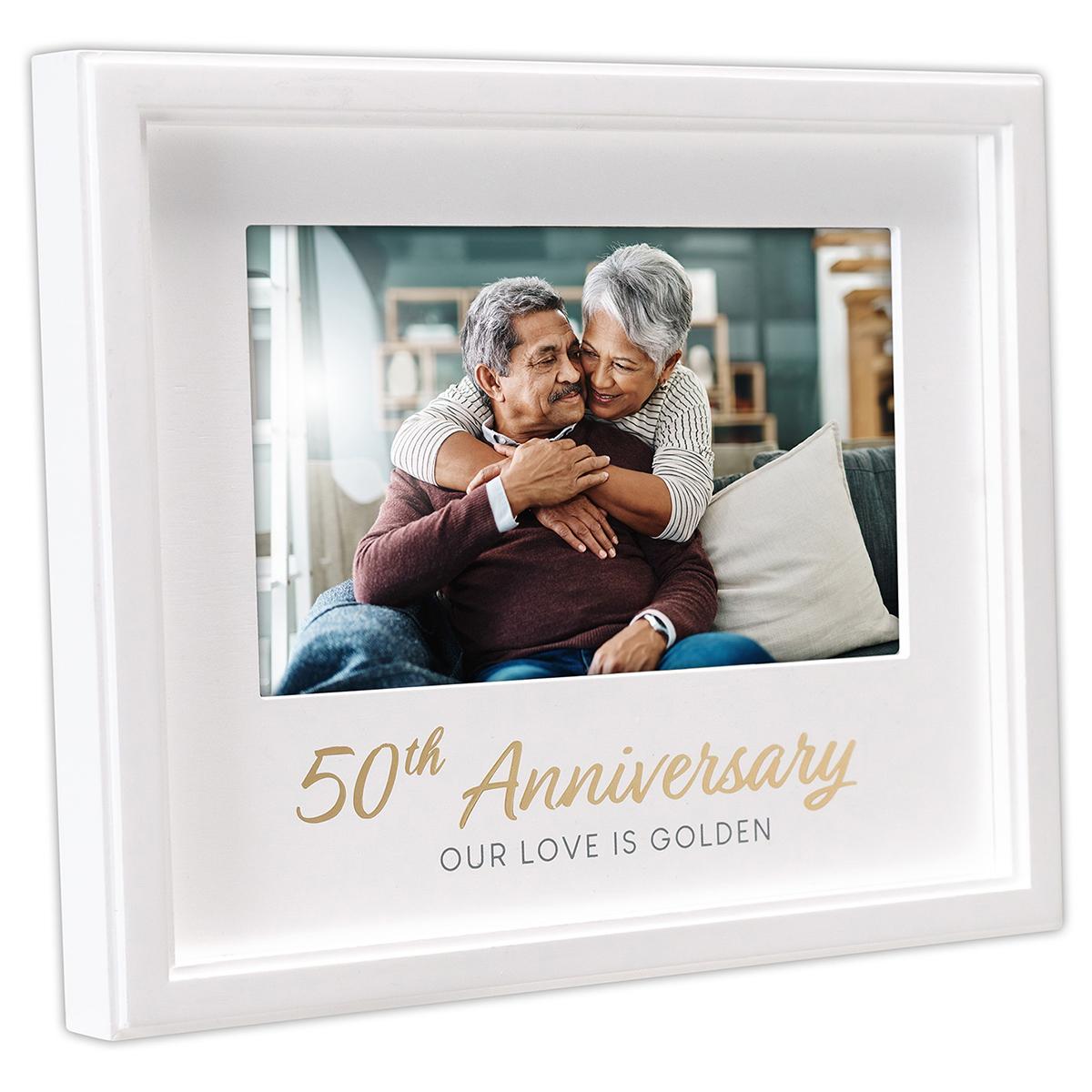 Share all the fun in your life with those you love with this Malden "50th Anniversary" frame. It features a glare-resistant glass lens and white engineered wood with an inscribed sentiment "Our Love is Golden." There is an easel back for desktop display and wall mounts for easy hanging.