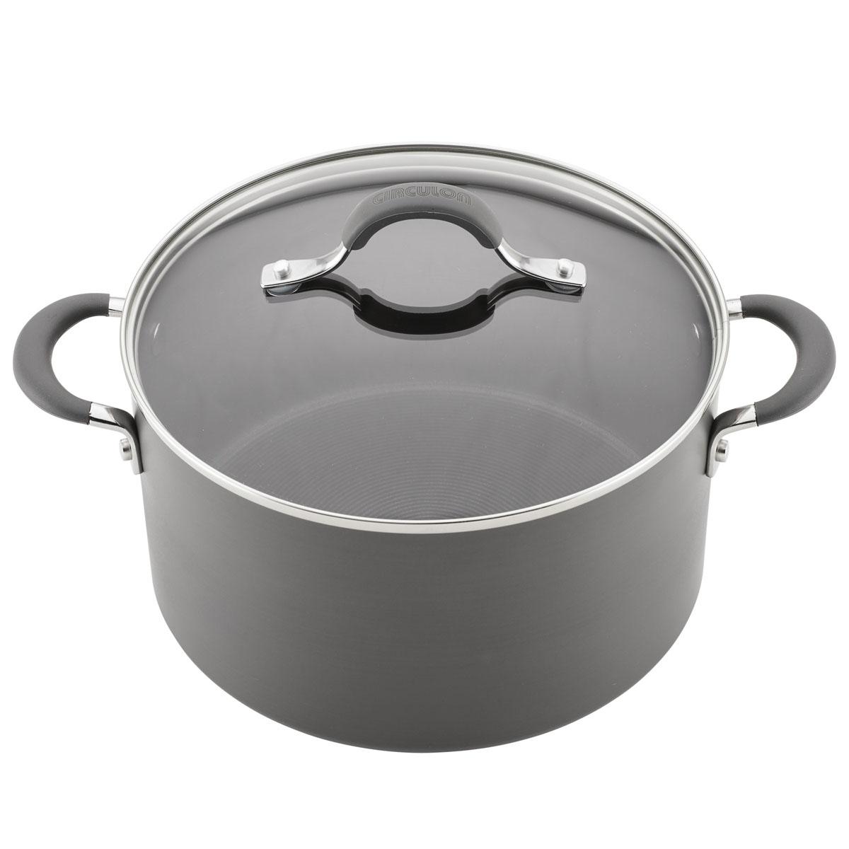 Energize the kitchen with this Circulon® Radiance 10-piece hard-anodized non-stick cookware set. These heavy-gauge hard-anodized pots and pans deliver balanced heating for every cooking technique, from a quick weekend lunch for the kids to a slowly simmered, succulent one-pot stew. Features the TOTAL® Non-stick System of raised circles and non-stick for natural food release and easy cleanup that lasts 10 times longer than normal non-stick.