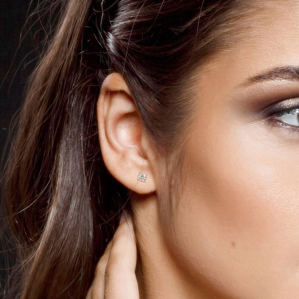 These Gemstone Classics™ traditional solitaire stud earrings are crafted in sterling silver. They feature two round-cut, prong-set created white moissanite gemstones. Enhanced with a high-polish finish, the earrings are secured with butterfly backs. These beautiful solitaire earrings are the perfect way to show off your personal style with some glitter.