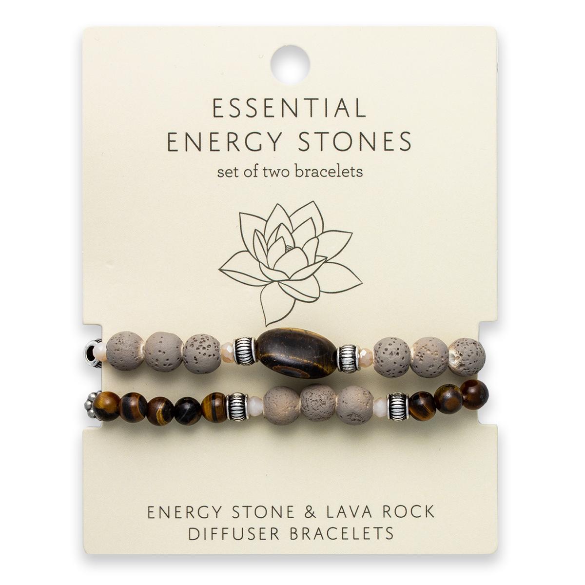 Accessorize your look with the Tiger eye and ivory lava beaded 2-piece stretch bracelet set with an energy stone story card.