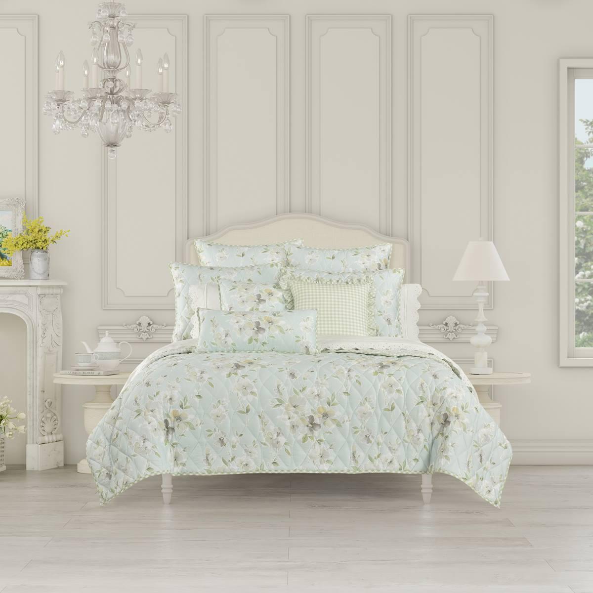 The J. Queen Cottage Cassia watercolor floral design brings the feeling of fresh English countryside into your home. A classic duck egg blue color anchors the soft green and taupe watercolor flowers, with pops of yellow and white throughout. Paired with a quintessential matching green gingham check for the binding, and reversing to a soft, ditsy floral print. Quilted with an elegant lattice stitch design and lightweight fill. Designed to coordinate with the Cassia shams, pillows, and window treatments or it can be mixed and matched with Piper & Wright bedding and bath pieces.This item requires oversize delivery. Please refer to the Order Summary in the Shipping step at checkout for delivery charge.