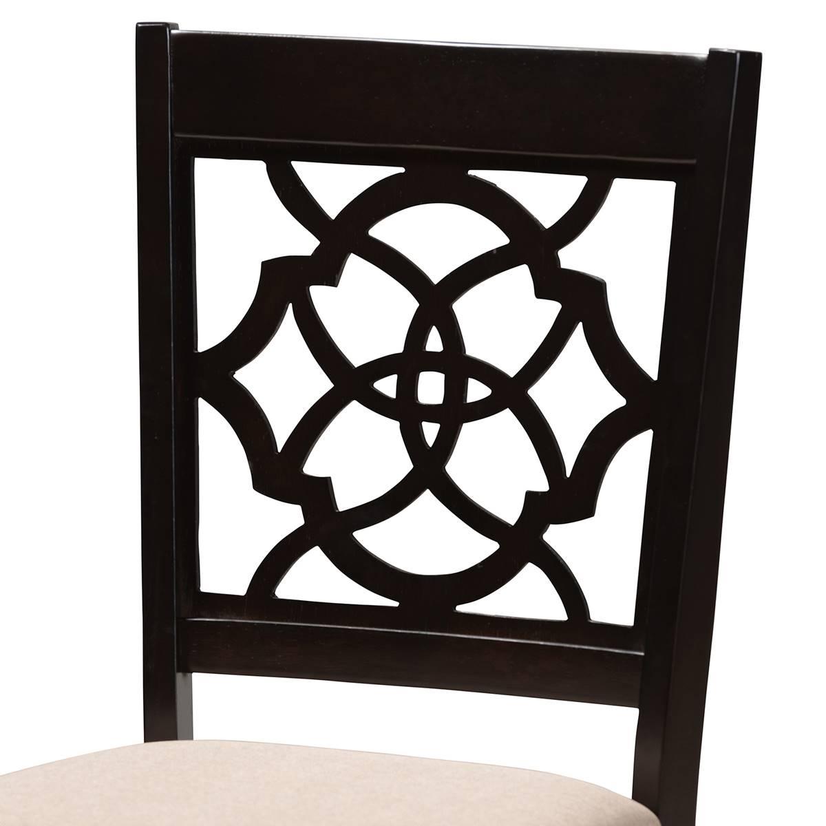 This Baxton Studio Renaud 5 piece wood dining set is a great way to reinvent your dining room! Constructed with solid oak wood, this dining set includes one table and four chairs, each upholstered in a light polyester fabric that complements the rich espresso wood finish. Designed with both comfort and style in mind, each chair features a plush foam-padded seat, as well as an exquisite cut-out design on its back. Saber legs add a classic, refined touch. Built for long dinners with family and friends.