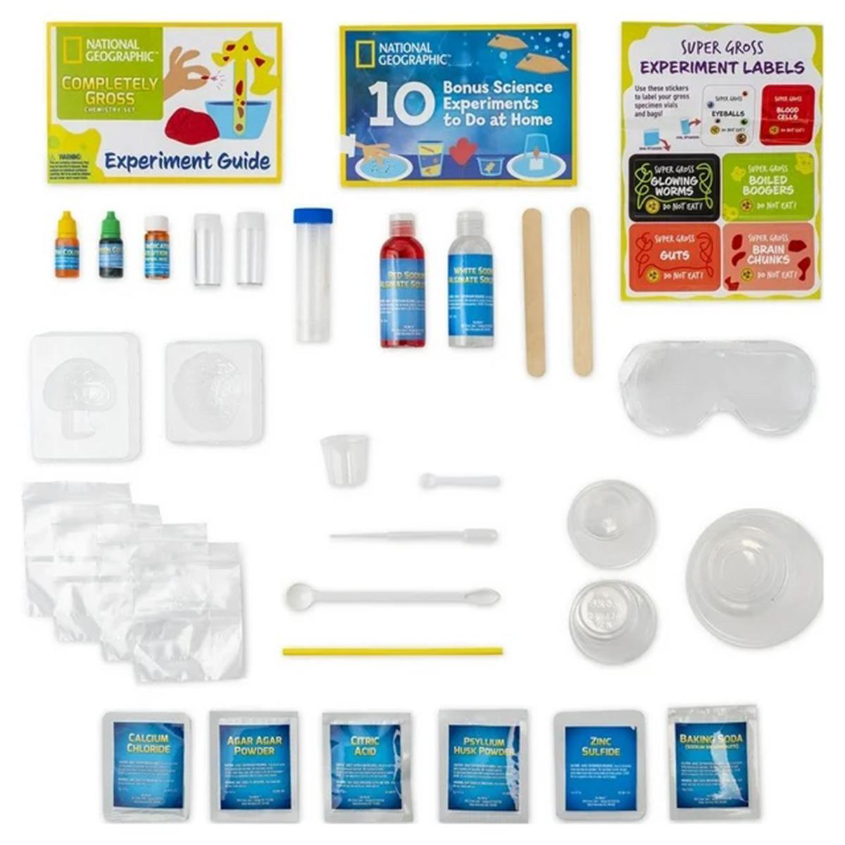 Description The National Geographic™ completely gross chemistry set gives kids everything they need for 15 incredibly gross experiments, along with an extra experiment guide...