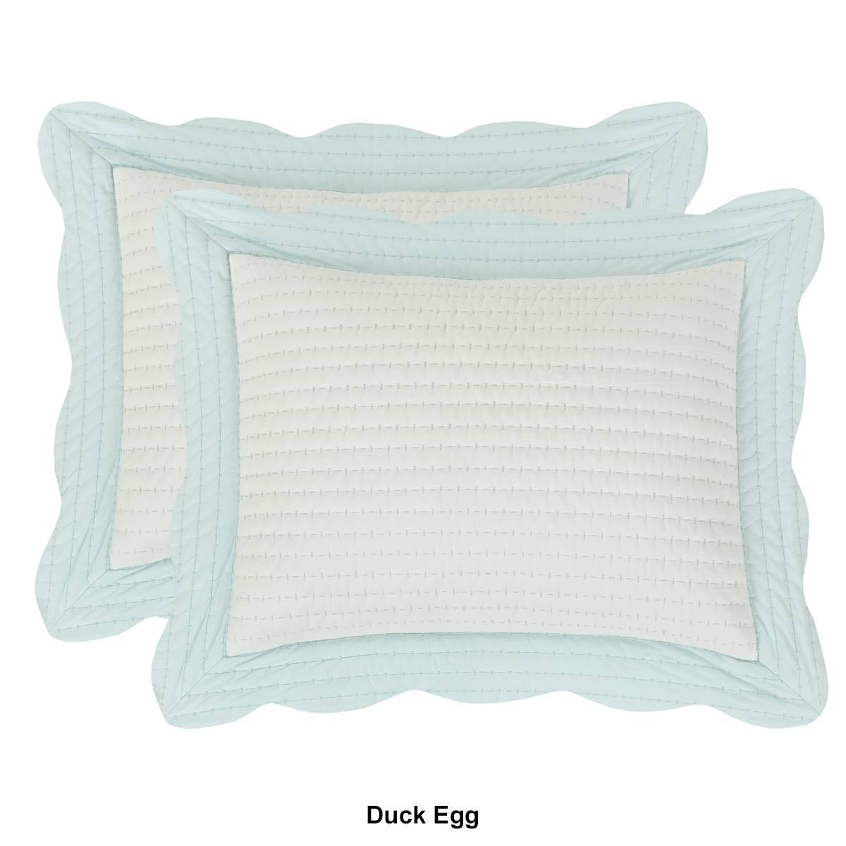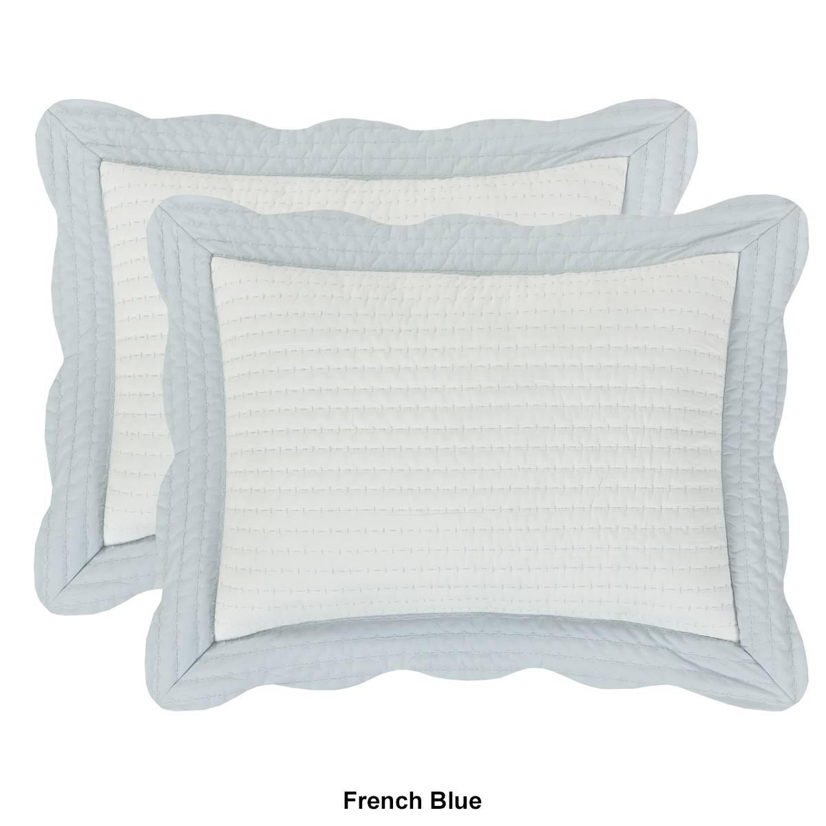 The J. Queen Cottage Amherst pillow sham features white cotton framed with a relaxed scallop flange on four sides. Constructed with soft pre-washed 100% cotton with a hidden zipper on the reverse to discreetly stow your pillow stuffer. Quilted on the face and flange with intricate channel stitching, and the reverse fabric matches the border color, which is available in multiple color options to fit your style.