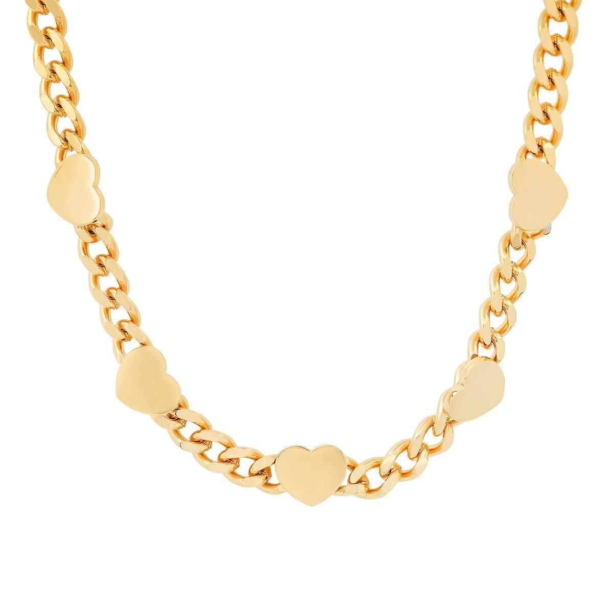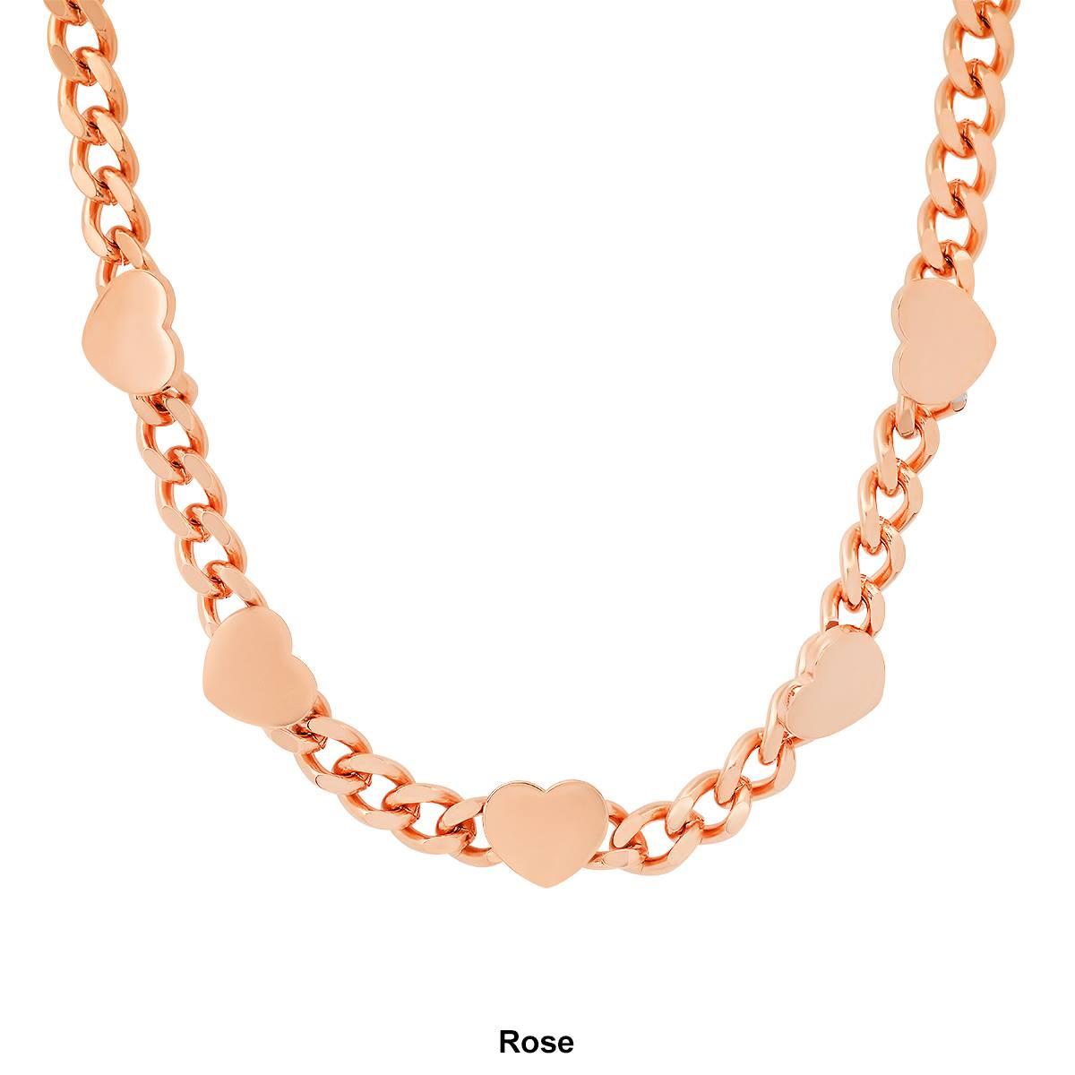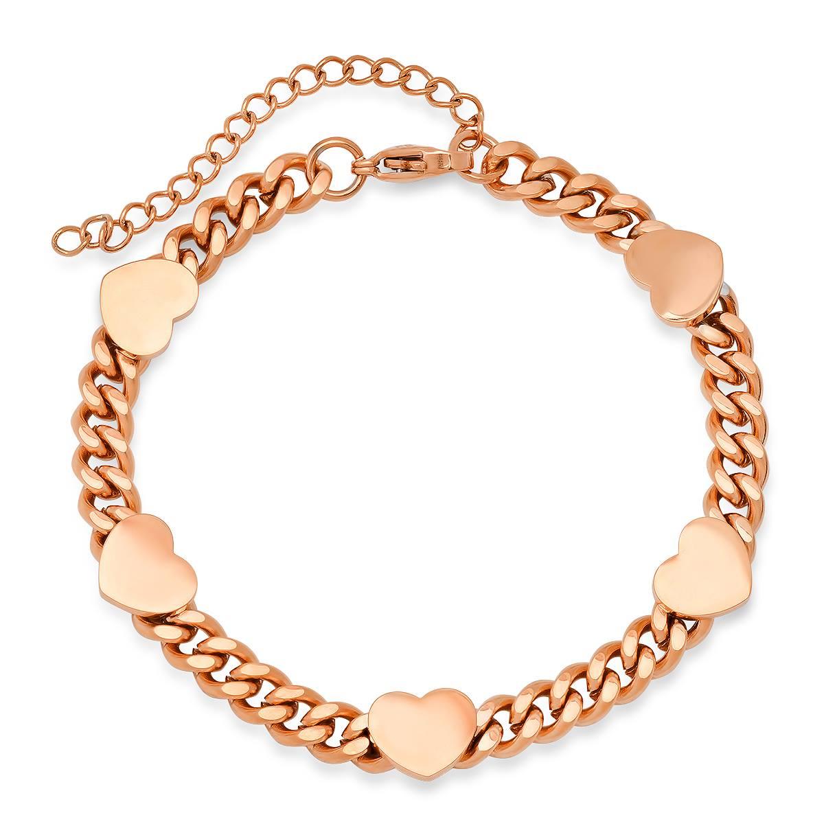 Get a sweet look with this Steeltime 18kt. Gold Plated resizable heart bracelet and necklace set. It also works great as a gift. The necklace and bracelet are made of premium stainless steel featuring 5 heart charms.
