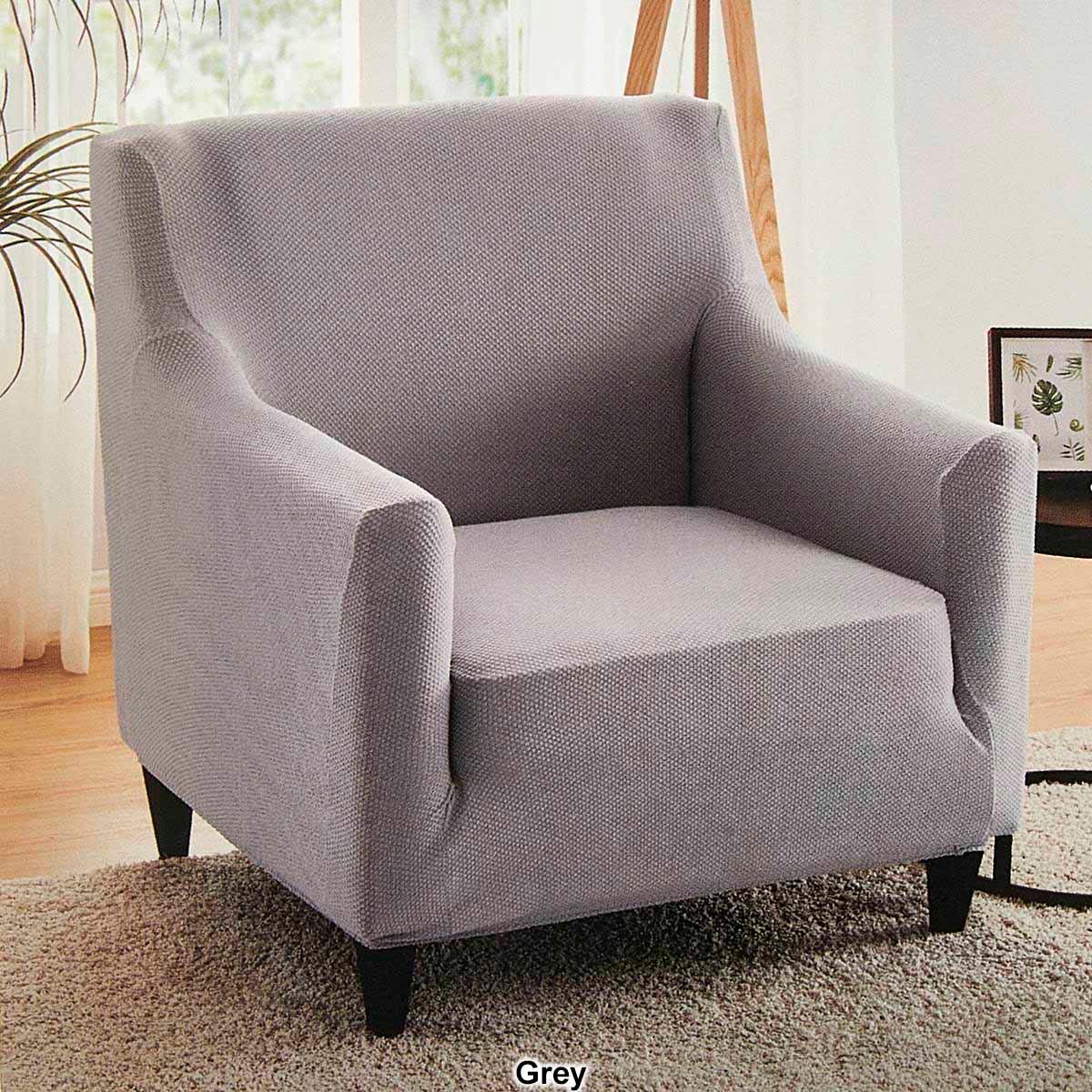 Description Stretch chair slipcoverFits most upholstered furnitureElastic at hemOne-piece design Care: Machine Wash Material: Polyester, Spandex Item #: 754759 Pricing Disclosure