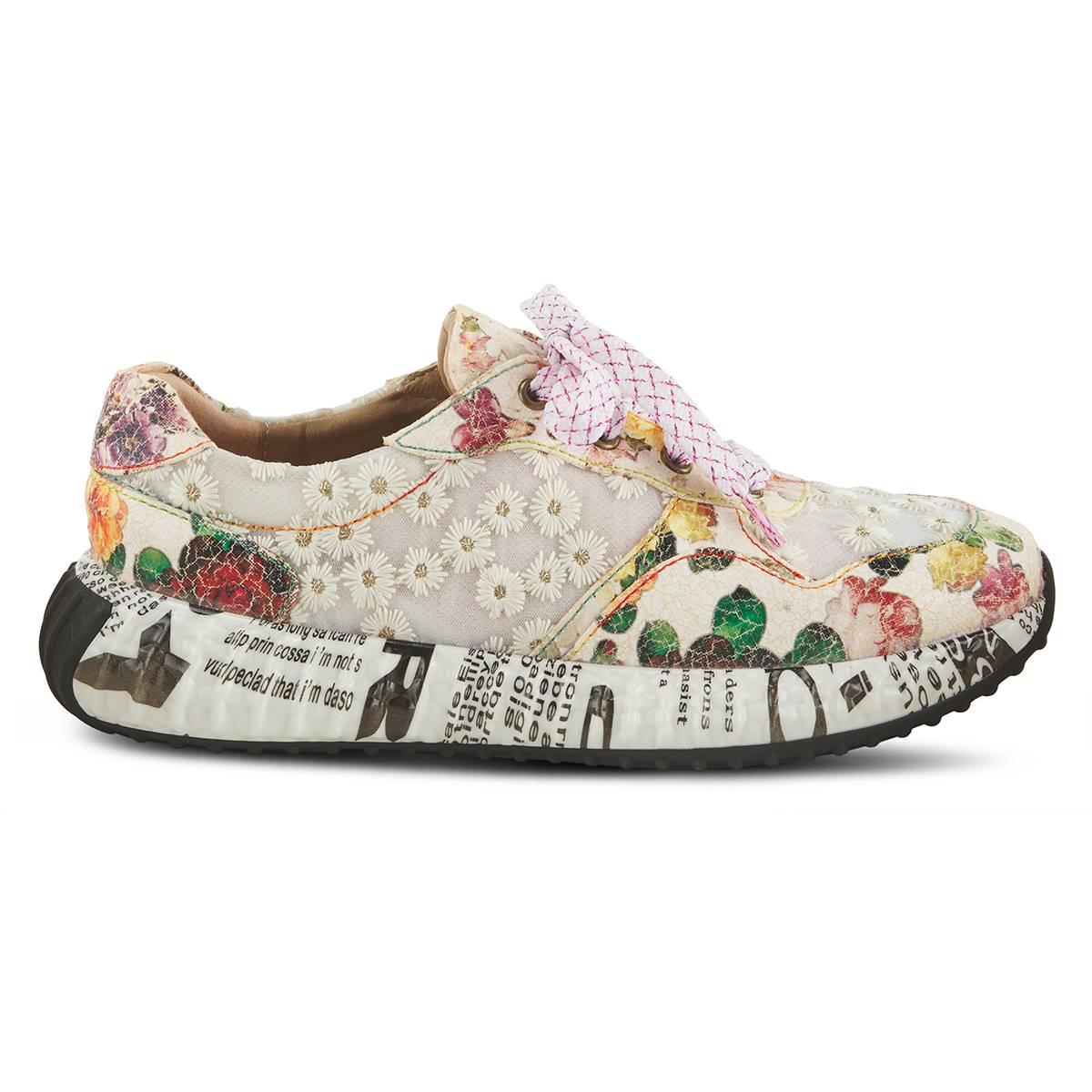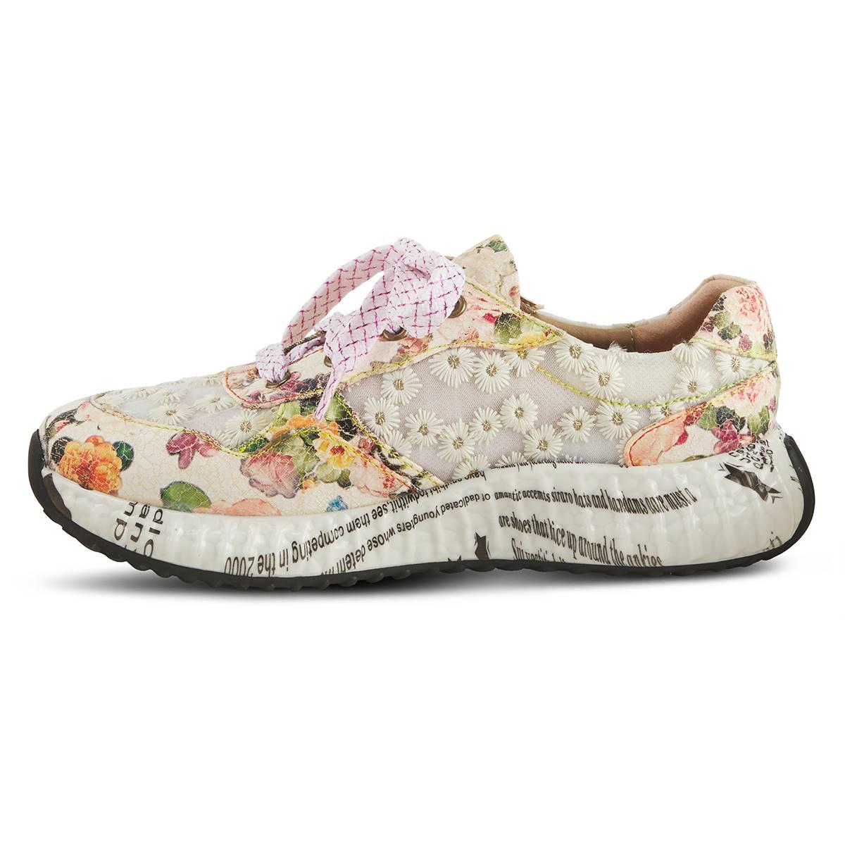 Push yourself out of your comfort zone with these Womens L’Artiste by Spring Step Daisymae lace-up fashion sneakers. Following the shoe are daisies and handpainted crackle floral patterns. The newspaper drop heel outsole and metallic laces spice up this sneaker.
