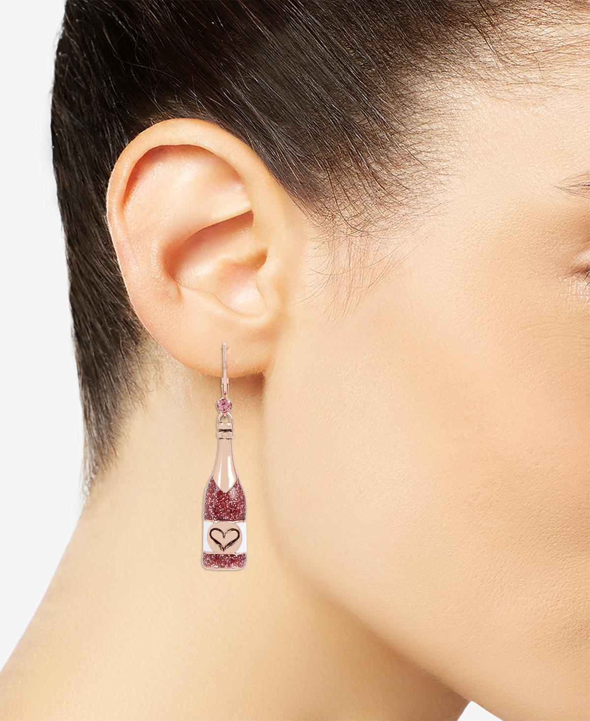 These Betsey Johnson mismatched drop earrings with glitter effect rose bottle and grape cluster embellished with small crystal stone accent and rose gold-tone details make the perfect final touch.