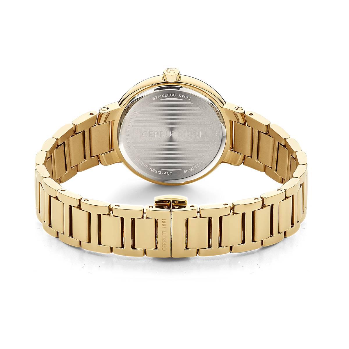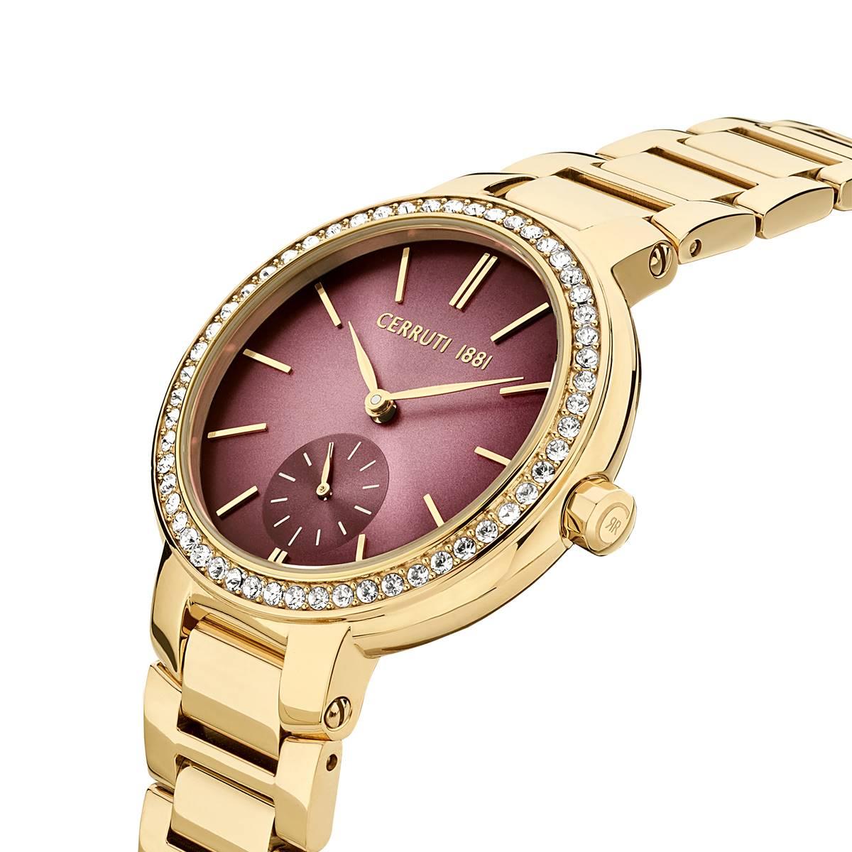 This watch from the Faenza collection features a 34mm gold-tone case. The bezel is lined with Swarovski crystal stones which accentuates the red dial. The watch is completed with a gold-tone stainless steel bracelet. True to the Cerruti 1881 brand, this watch is elegant and timeless.
