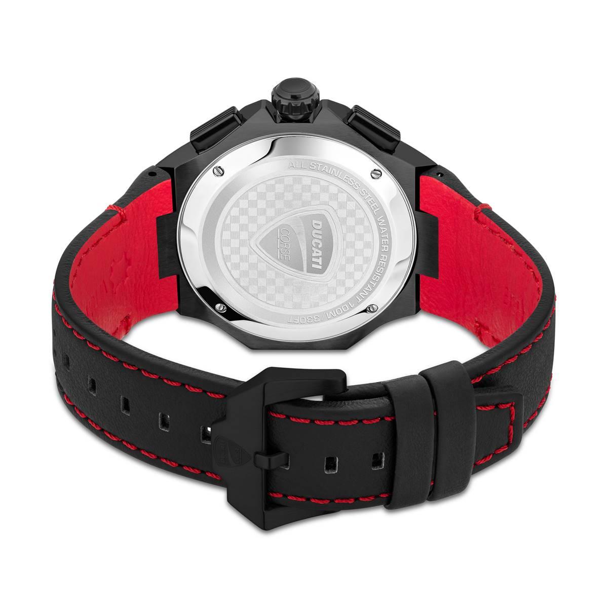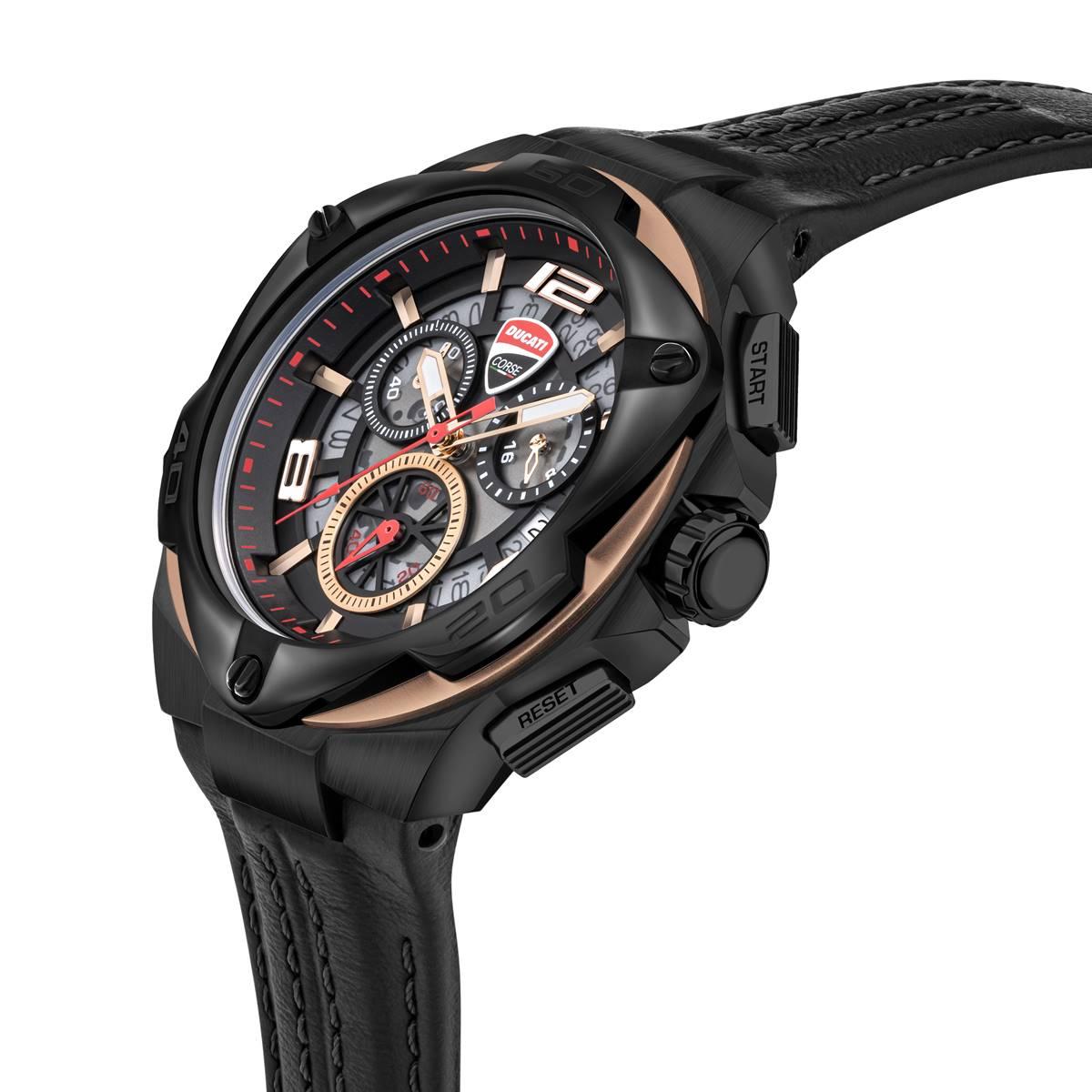 The skeleton spoke-like layered dial features three subdials each with its own functionality. The rose gold indexes are complimented with pops of red and the Ducati Corse shield. The black leather strap with tonal stitching provides a sporty comfortable fit.