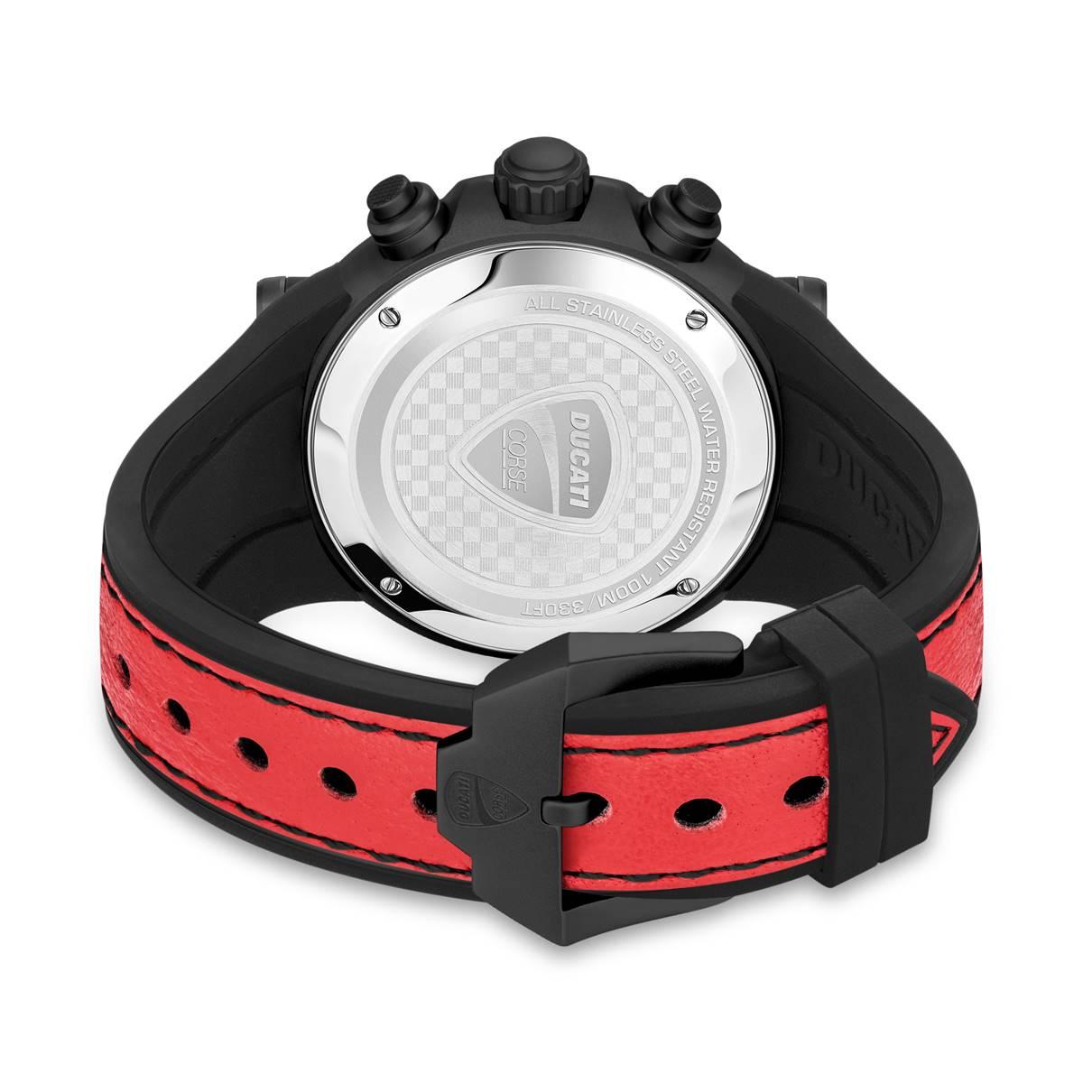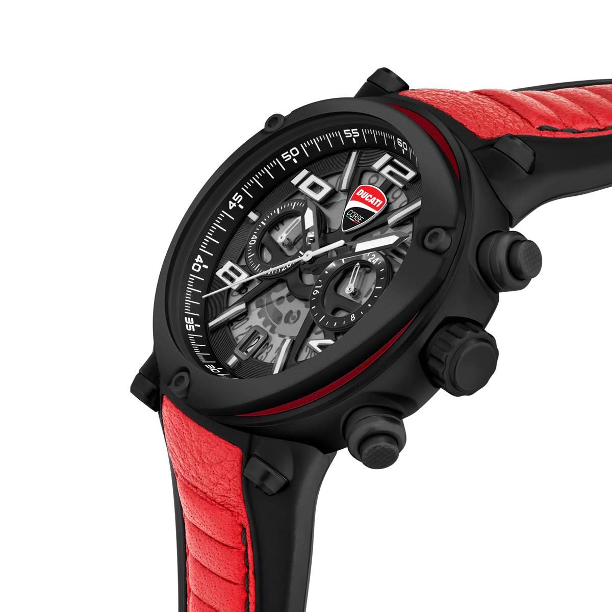 This black-spoke-like layered dial features a skeleton calendar and two subdials with their own functionalities. The watch is completed with the Ducati Corse shield.