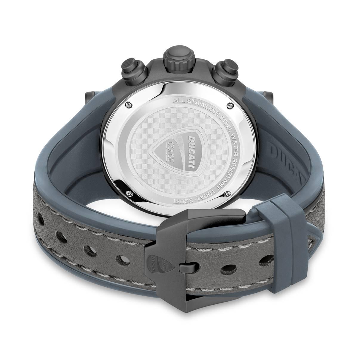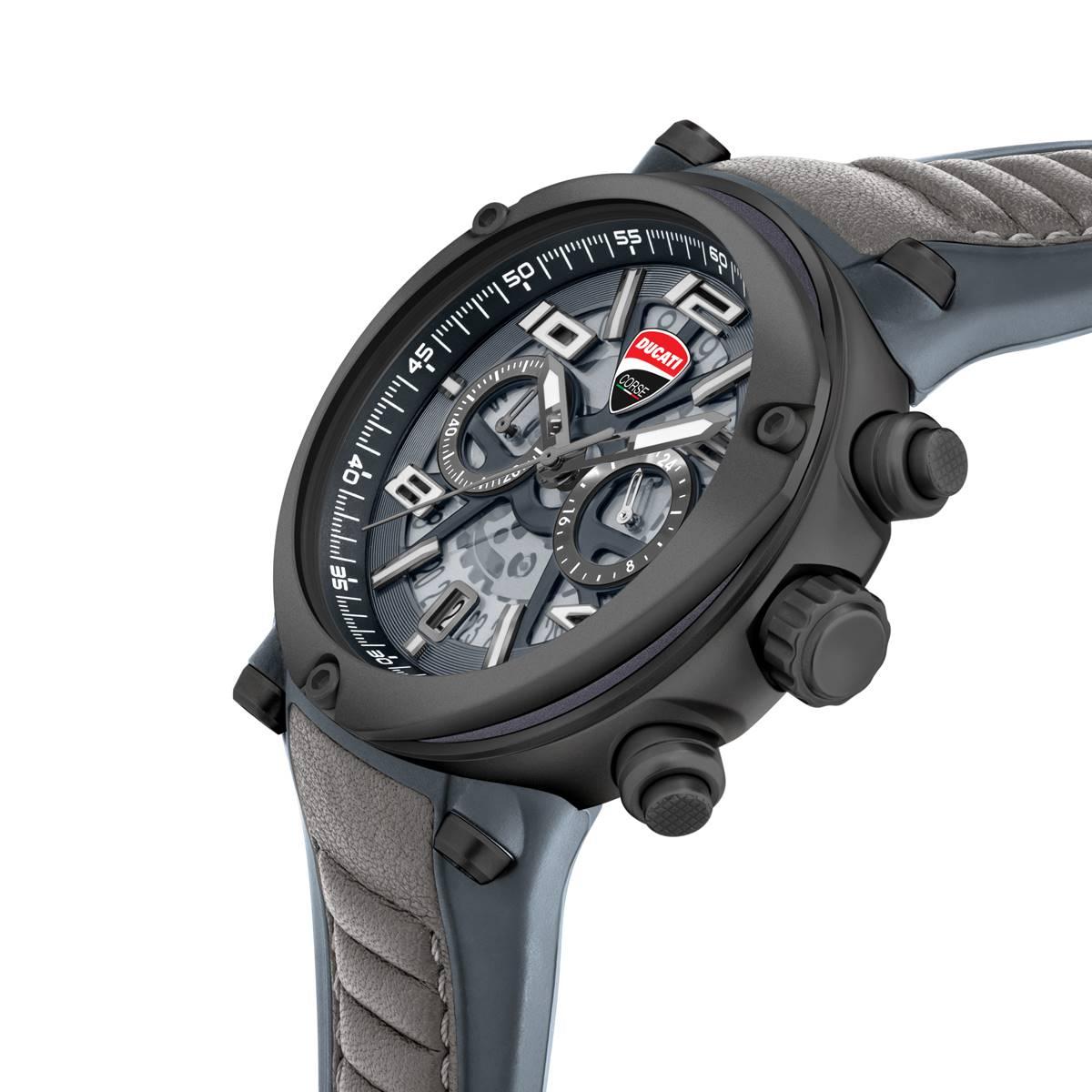 The grey spoke-like layered dial features a skeleton calendar and two subdials each with its own functionalities. The watch is completed with the Ducati Corse shield.