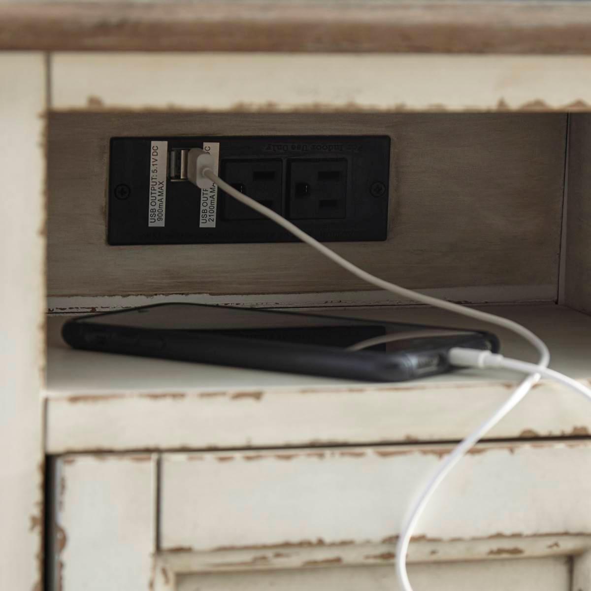 The Signature Design by Ashley Realyn chairside end table is traditional cottage styling made for modern living. Antiqued two-tone finish blends a chipped white with a distressed wood finished top for a double serving of charm. Cleverly placed AC power outlets and USB charging ports are beautifully in tune with your high-tech needs.
