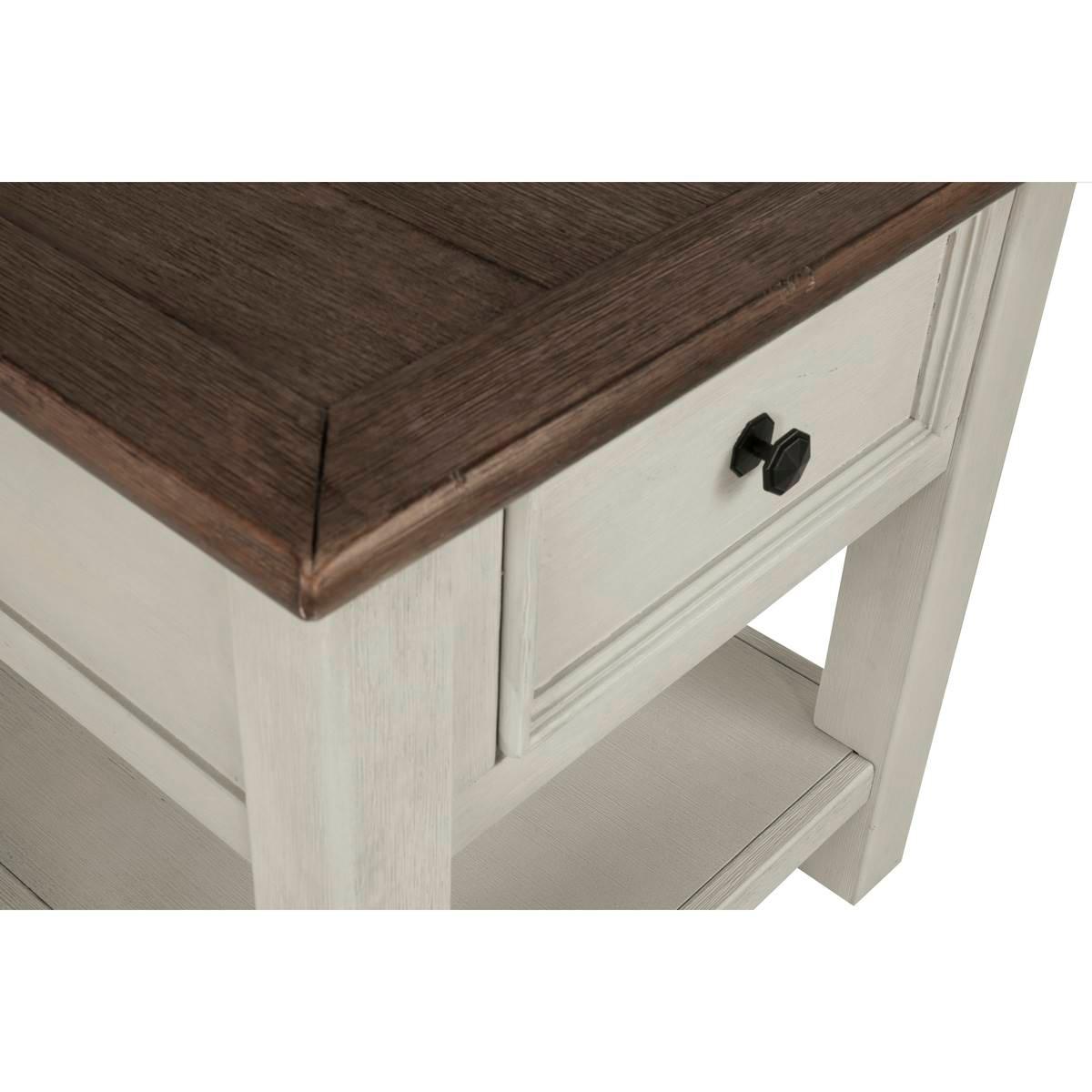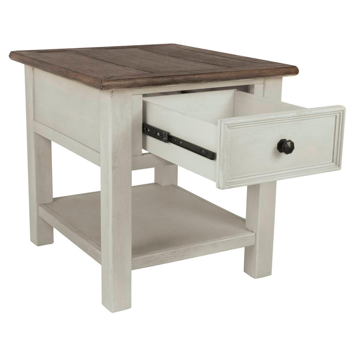 Whether your style is farmhouse fresh, shabby chic, or country cottage, you’ll find the Signature Design by Ashley Bolanburg end table is a perfect fit for your home. Its two-tone, gently distressed finish pairs weathered oak with antique white for that much more quaint character. Charming elements include a plank-and-frame style top, black faceted hardware, and a smooth-gliding drawer for remote controls and more.
