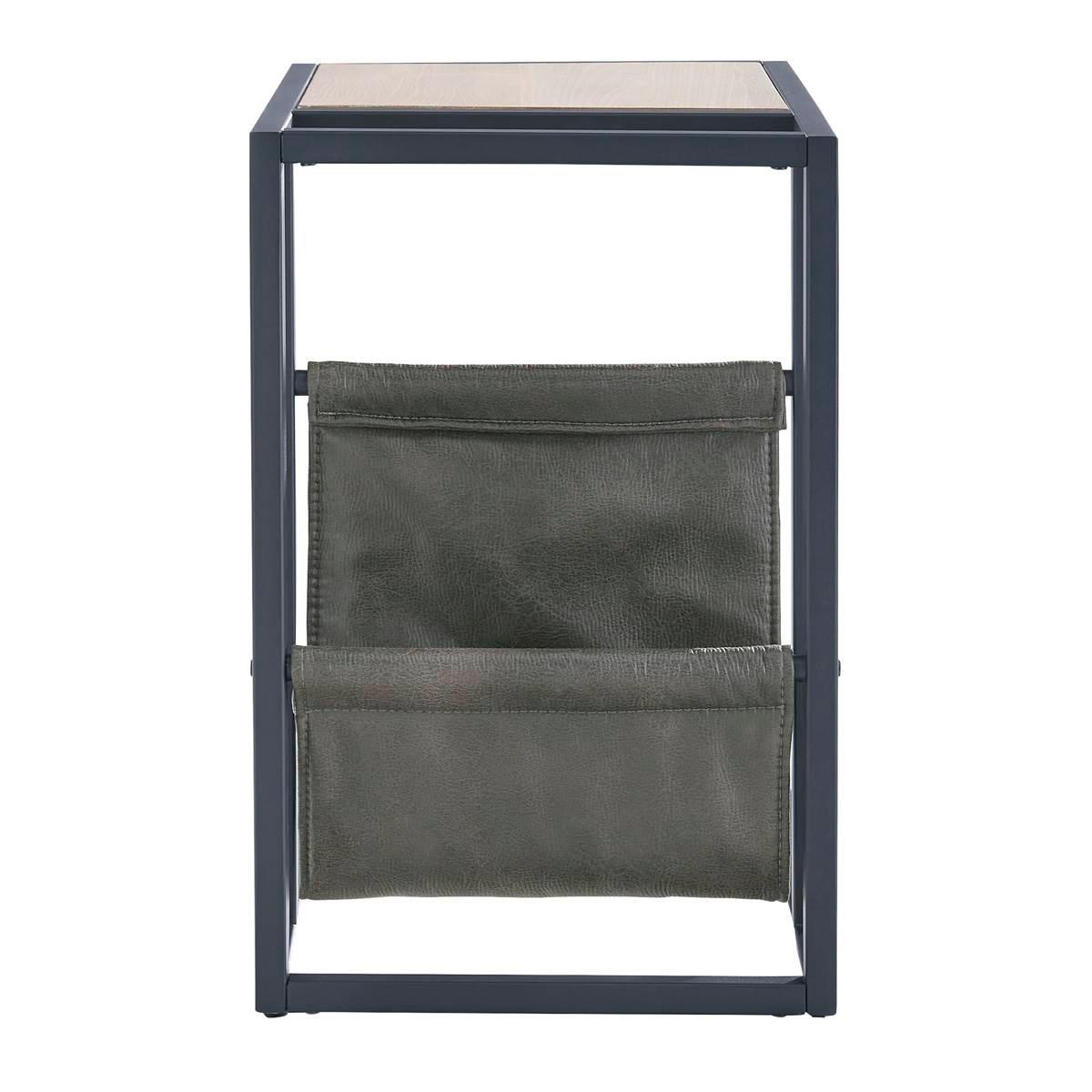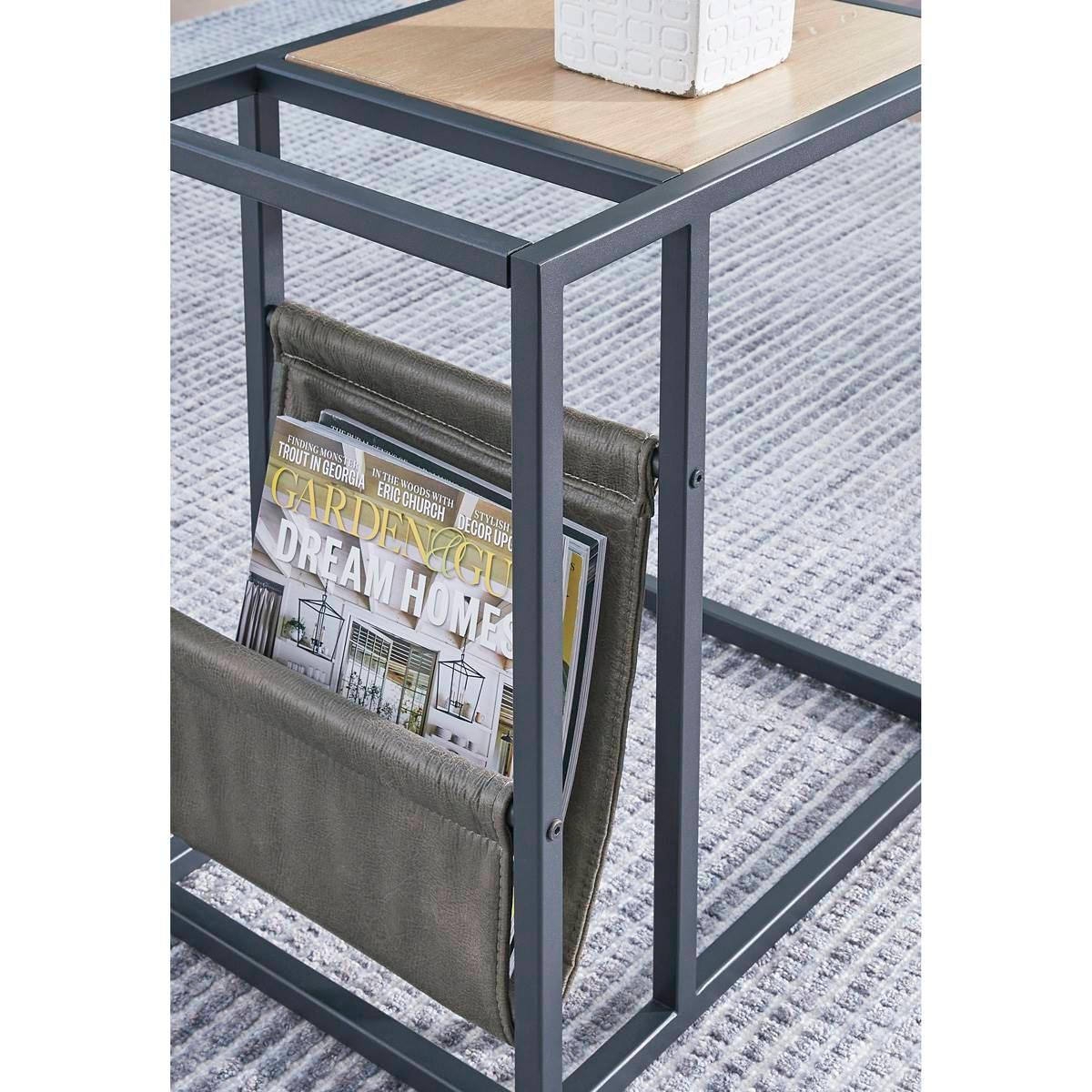 Casual contemporary design with a clean silhouette. That´s the beauty of the Signature Design by Ashley Freslowe chairside end table. Quality crafted with elm veneer, its tabletop is finished in a light natural wood tone that lends a fresh, organic look. The cool metal C-frame in a matte black finish and a hanging magazine basket made with durable brown faux leather coordinate beautifully with the less-is-more profile.