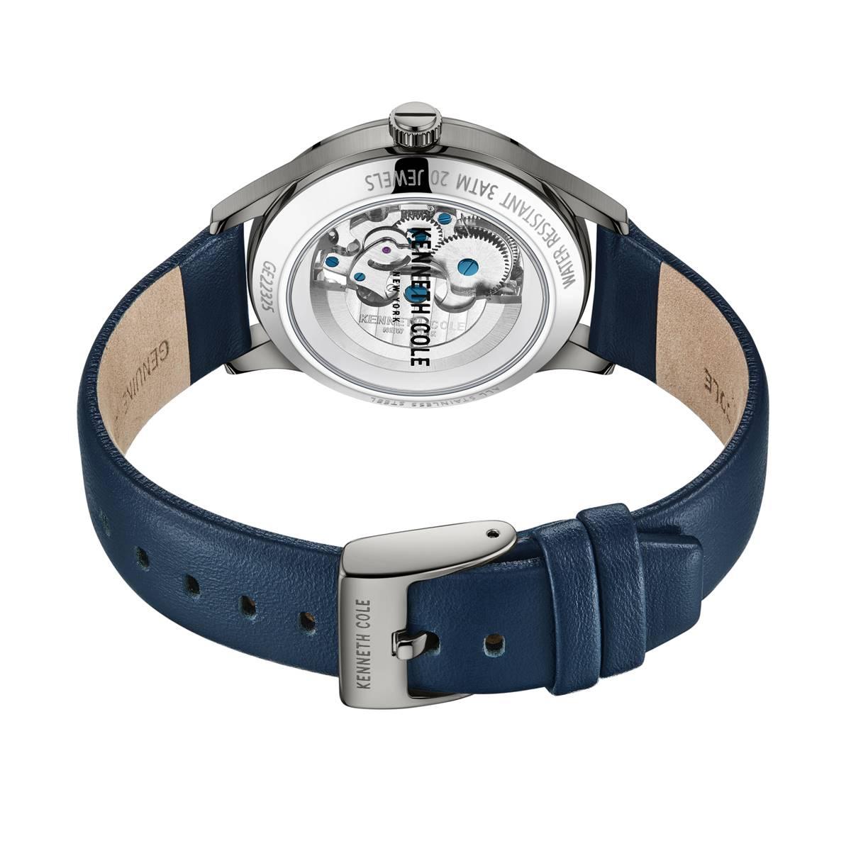 This Mens Kenneth Cole® New York watch offers skeleton automatic movement. The 42mm case is accented with a gunmetal-tone outer dial which highlights the inner workings of the automatic movement. The watch is completed with a blue genuine leather strap and an anti-glare crystal.