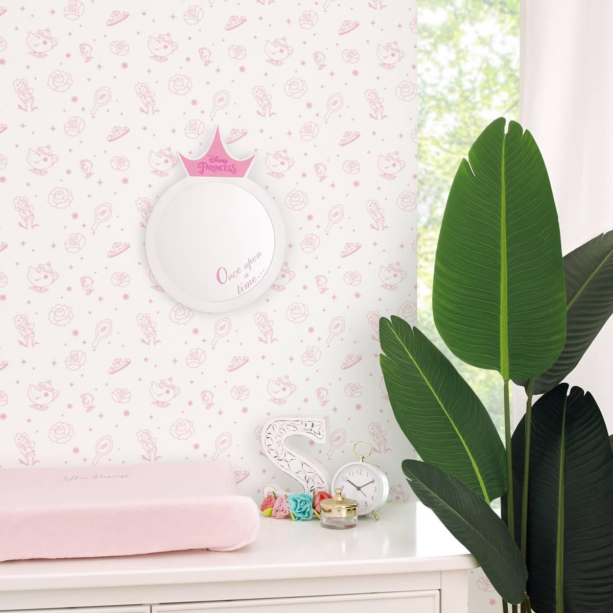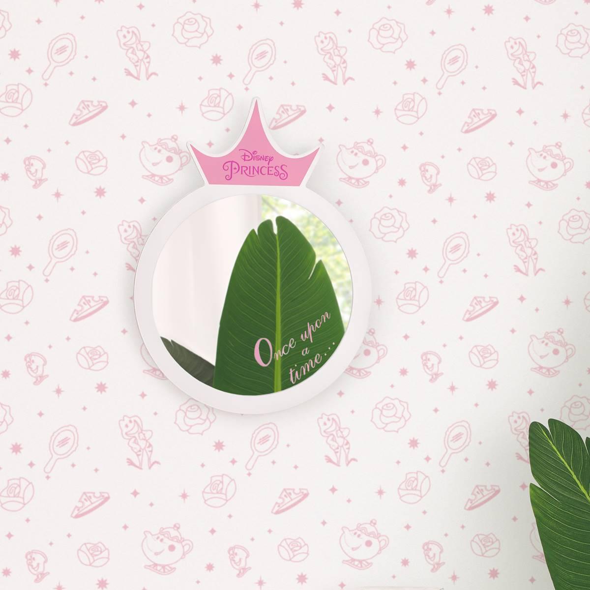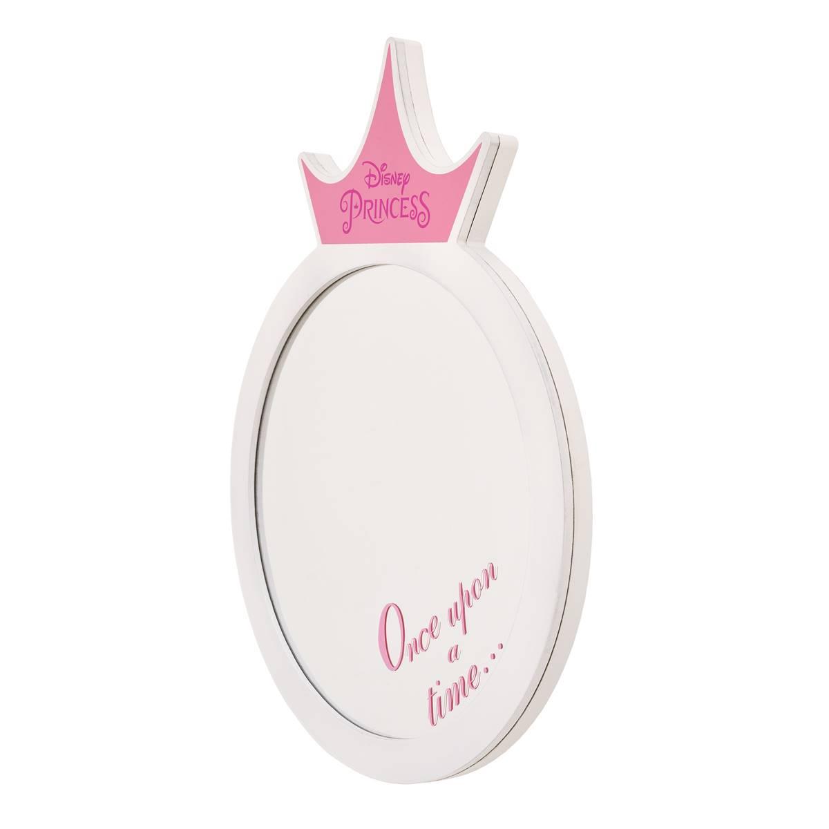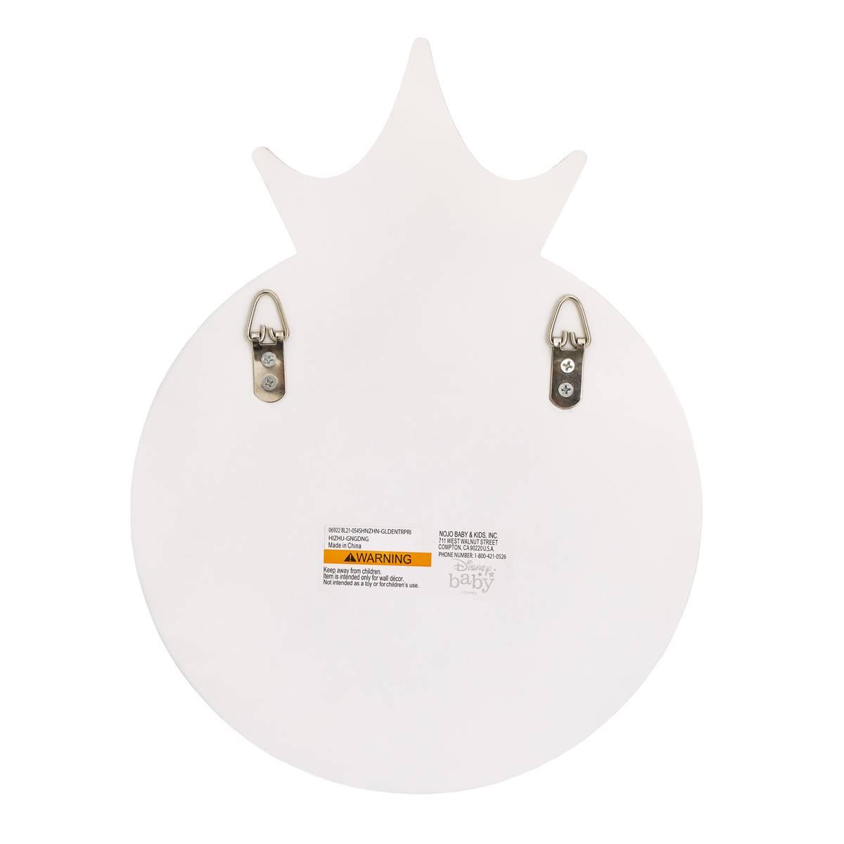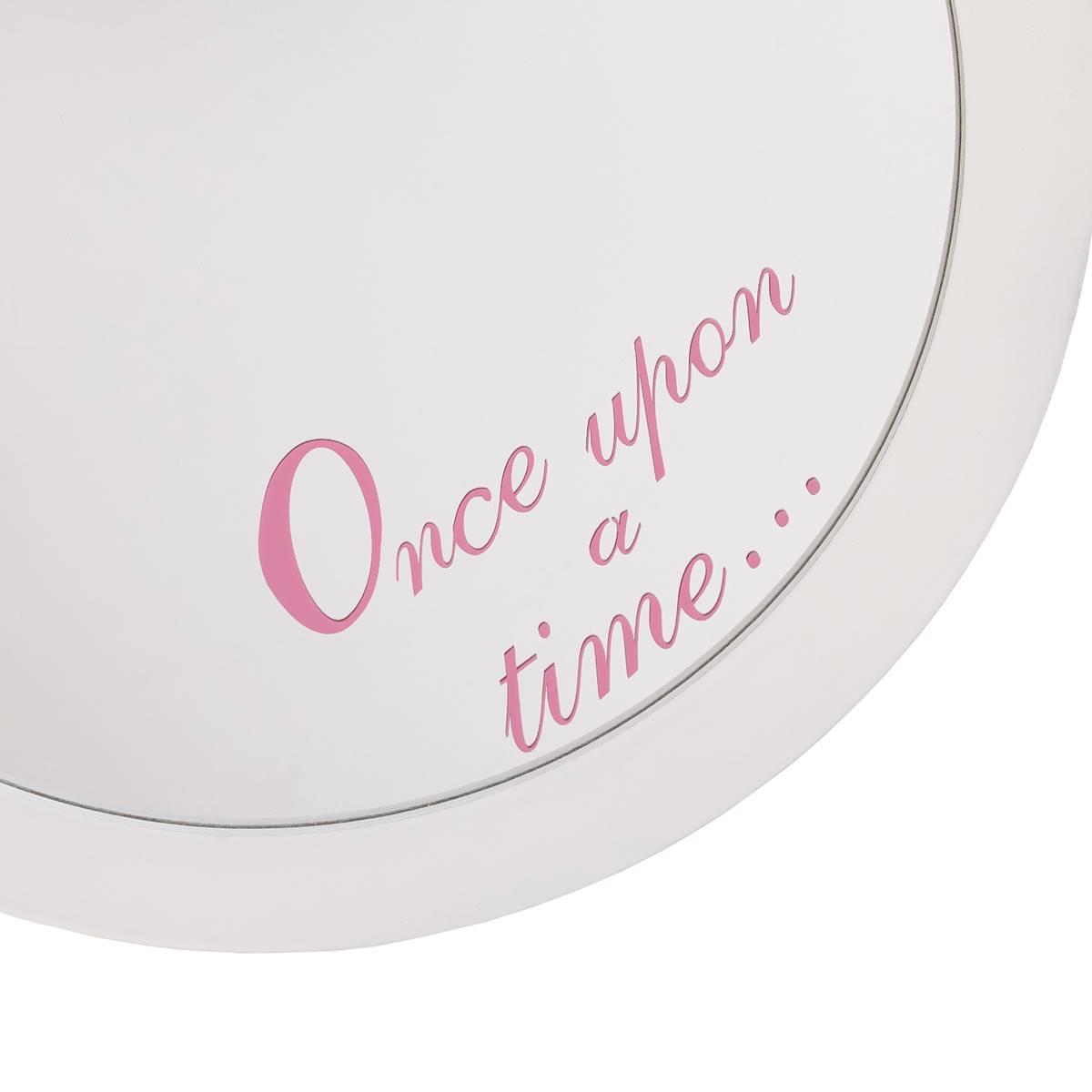 Mirror Mirror on the Wall, the Disney Once Upon a Time mirror is the fairest of them all! Features a white round wooden framed wall mirror with an adorable bright pink tiara at the top that says, "Disney Princess". Accented onto the mirror glass is the sweet saying in light pink letters, "Once Upon A Time." Includes two hooks on the back for easy hanging. The perfect wall decor for your Disney Princess nursery!