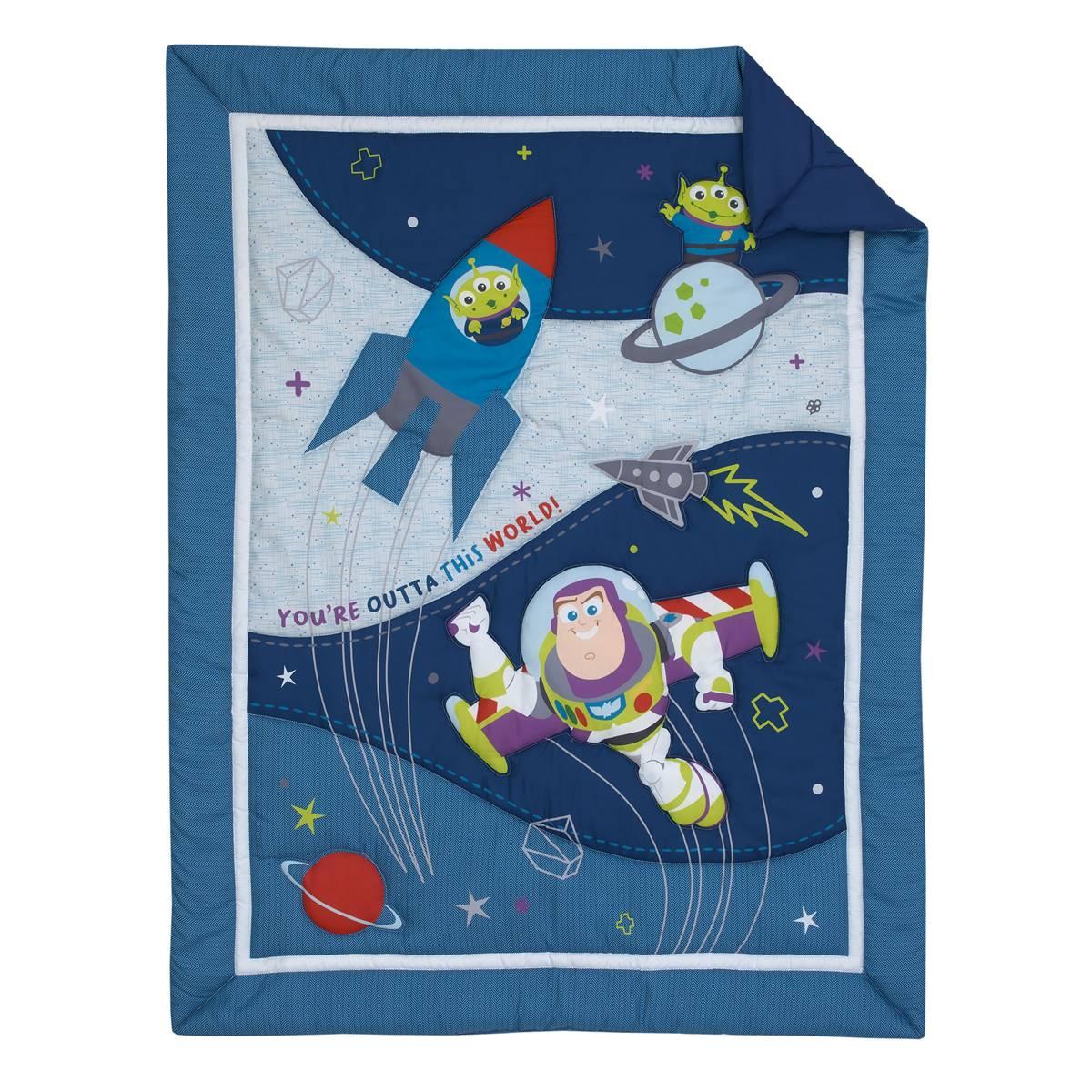 Your little one will soar to new heights with the Disney 3pc. Toy Story Outta This World crib bedding set. Featuring Buzz Lightyear and Aliens, perfect for a little boy´s nursery! The front of the comforter shows Buzz, and Aliens among a backdrop of rockets, planets, and stars on a blue background. The reverse of the comforter is a solid blue. The coordinating fitted sheet has a blue and white allover print pattern of stars, planets, rockets, Buzz, and Aliens.