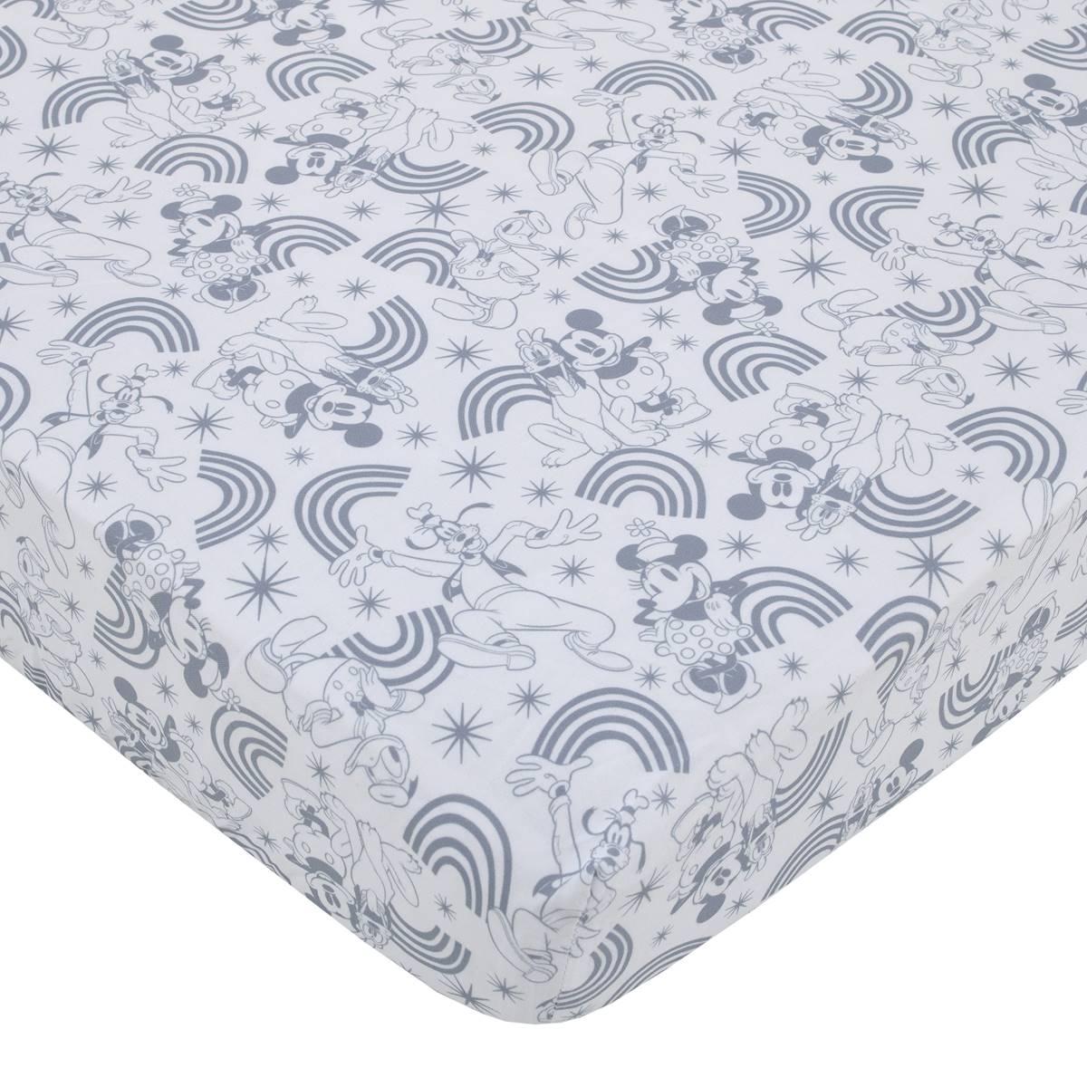 The Disney 3-piece Mickey and Friends mini crib bedding set will make you smile! The comforter features Mickey Mouse with his friends Minnie Mouse, Donald Duck, Goofy, and Pluto with welcoming words saying "Make Me Smile", "Be Happy", and "I Love My Best Friends"! The fitted mini crib sheets feature a blue and white allover print with rainbows, Mickey Mouse, and friends. Includes full elastic for a safe and snug fit.
