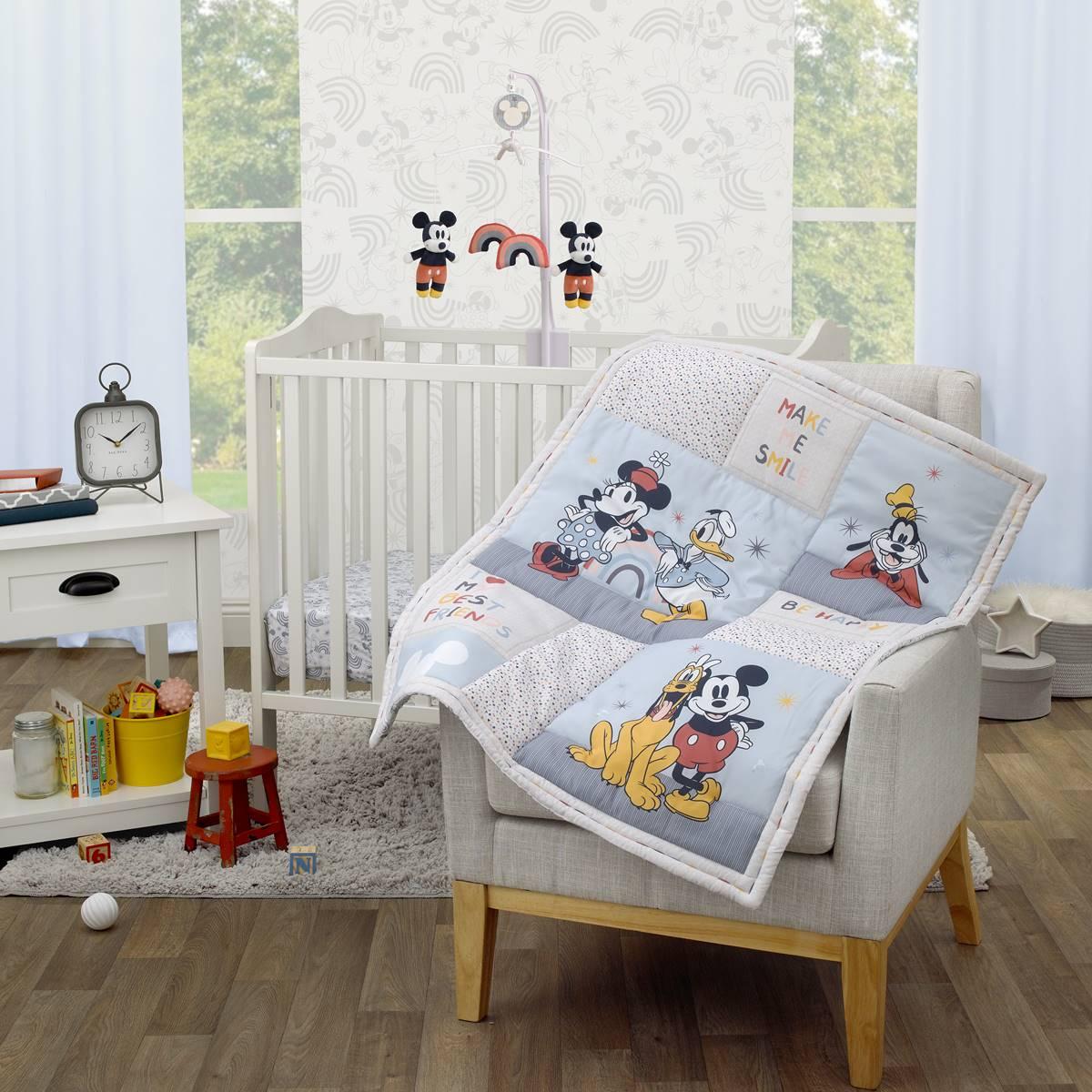 Description The Disney 3-piece Mickey and Friends mini crib bedding set will make you smile! The comforter features Mickey Mouse with his friends Minnie Mouse, Donald Duck,...