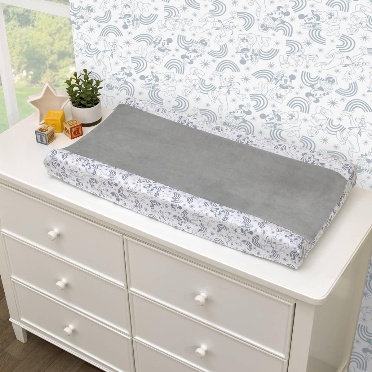 The Disney Mickey and Friends changing pad cover feature a cozy, solid grey center panel with a grey and white all-over Mickey and Friends pattern on the sides. Made with super soft fabrics and fits a standard-size contoured changing pad. Helps to keep the baby comfortable and dry.