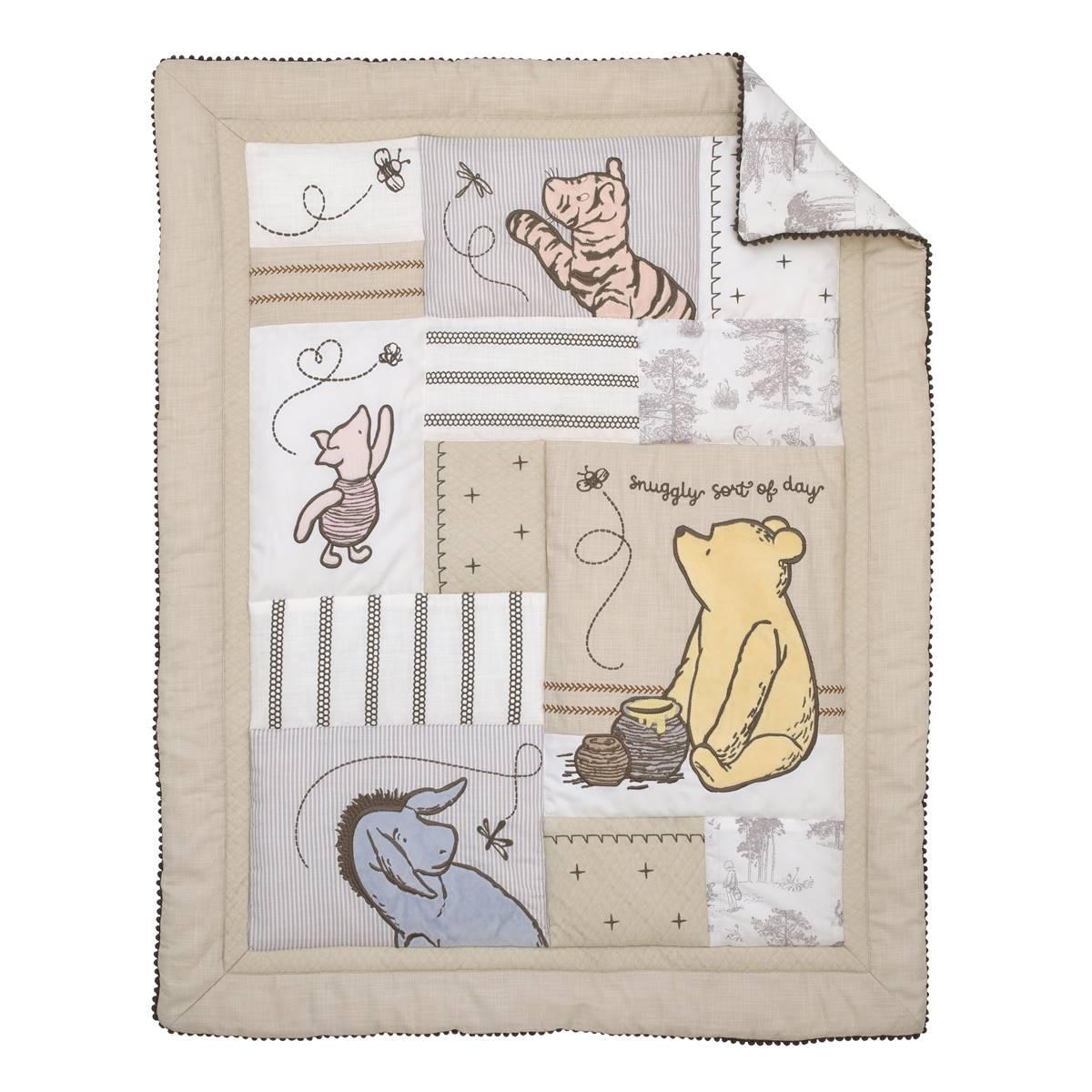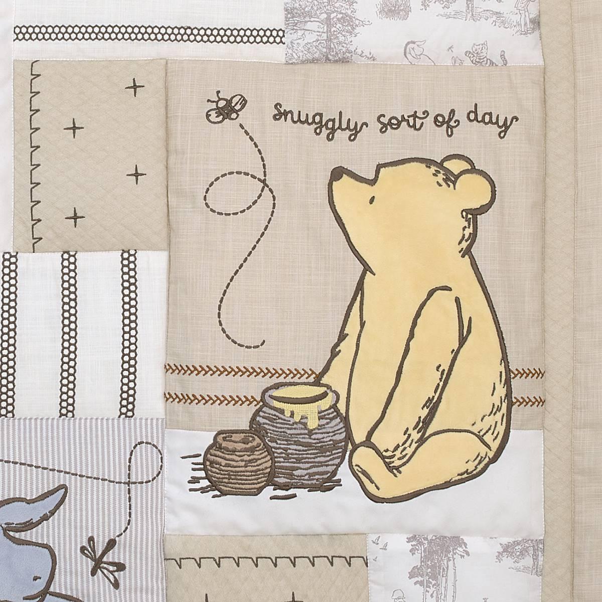 This Disney 3pc. Classic Pooh Hunny Fun nursery crib bedding set is sweet like honey! The comforter features a classic white and taupe colorway adorned with mixed pieced fabrics. The crib sheet features elastic all around the edges for a safe and snug fit. The crib skirt is a solid taupe made to look like real linen.