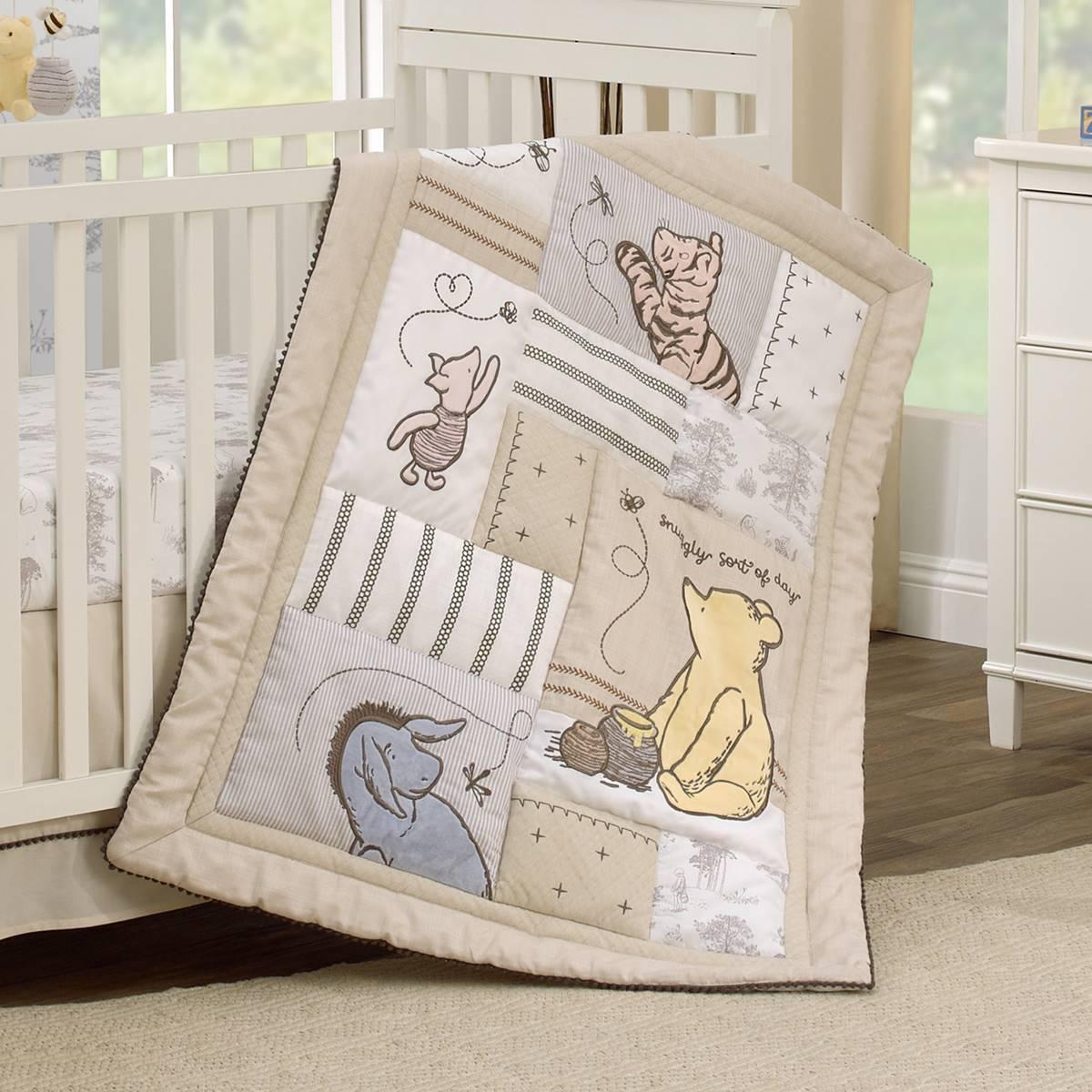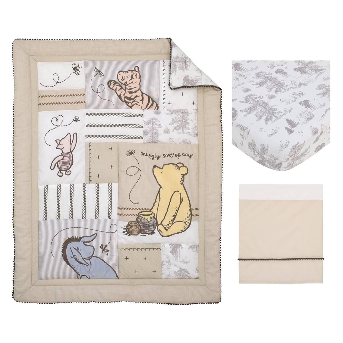 Description This Disney 3pc. Classic Pooh Hunny Fun nursery crib bedding set is sweet like honey! The comforter features a classic white and taupe colorway adorned with mixed...