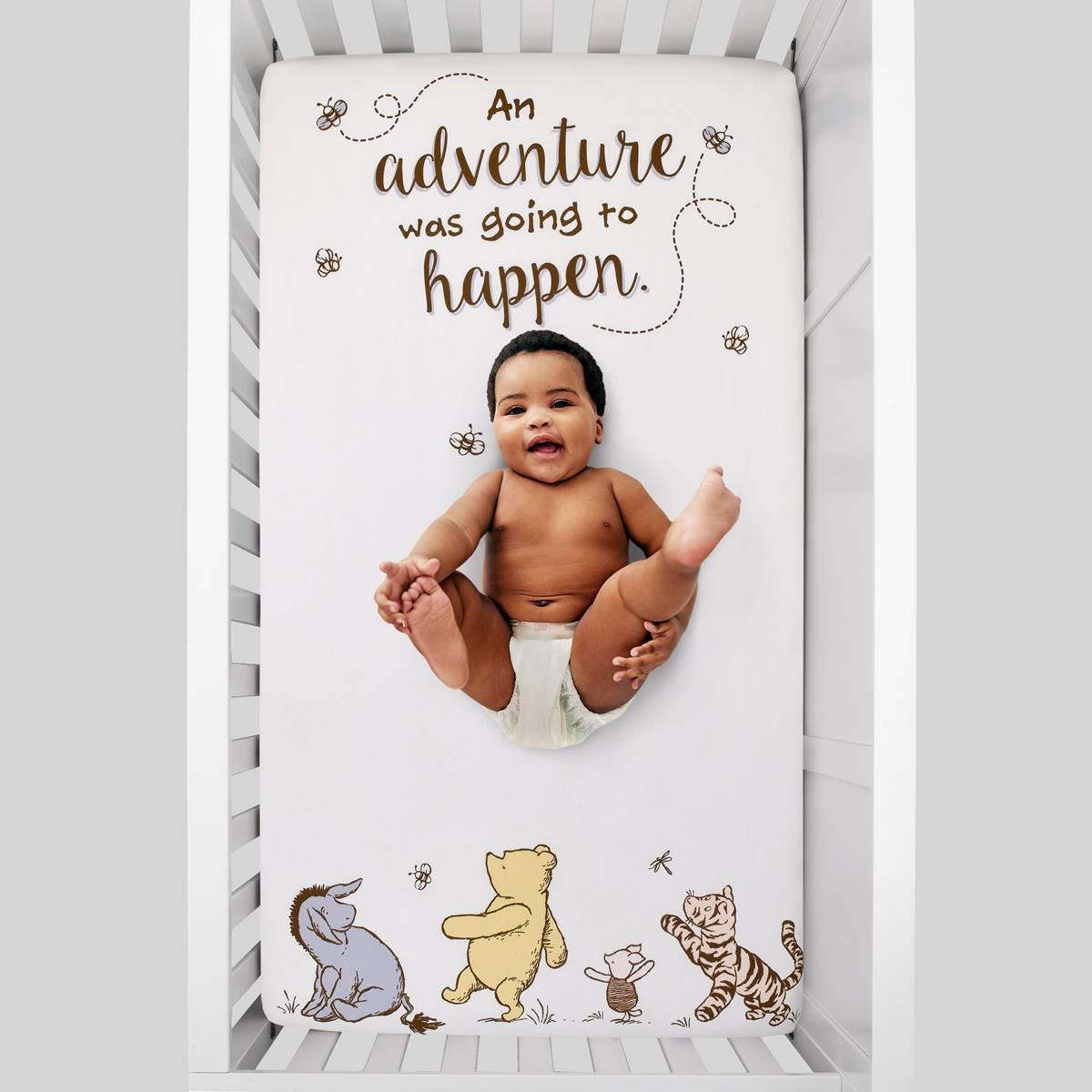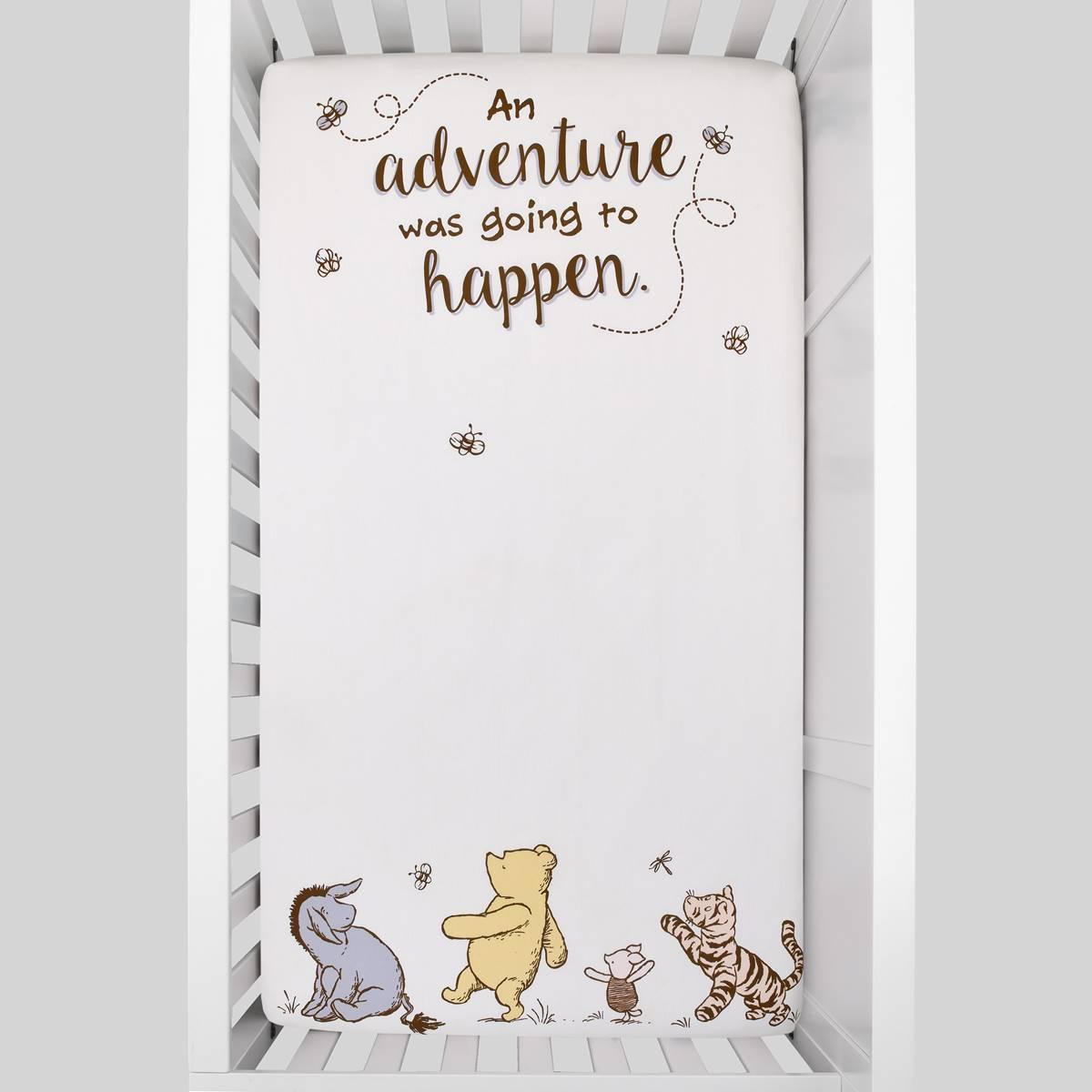 This Disney Classic Pooh Hunny Fun Photo Op Nursery fitted crib sheet is sweet like honey! Features a white ground with bees and all of the classic Winnie the Pooh characters! An Adventure Was Going to Happen script is featured at the top. This crib sheet is designed to create the perfect photo opportunity by capturing the baby´s milestones and special moments.
