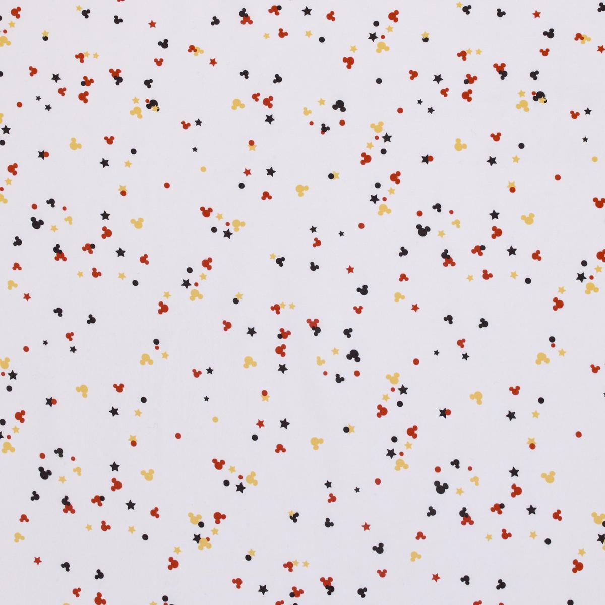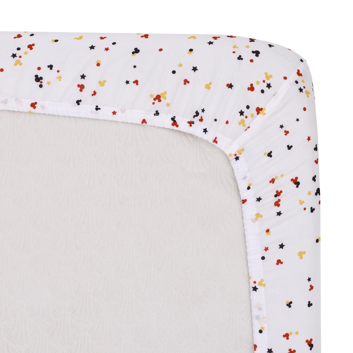 Add a sprinkling of colorful confetti to your nursery with this Disney Mickey Mouse confetti-fitted crib sheet. Features bright red, yellow, and black Mickey Mouse confetti with a mix of tiny dots, stars, and Mickey´s iconic ears scattered across a white sheet. Includes full elastic edges for a safe and snug fit. Fits a standard-size crib/toddler mattress.