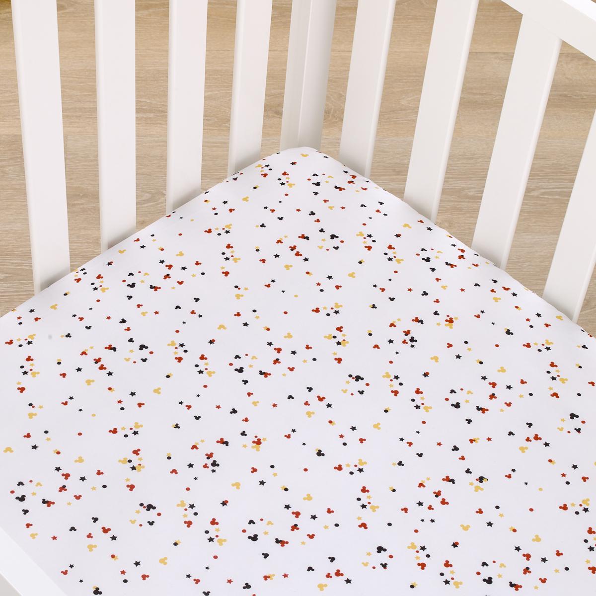 Description Add a sprinkling of colorful confetti to your nursery with this Disney Mickey Mouse confetti-fitted crib sheet. Features bright red, yellow, and black Mickey Mouse...