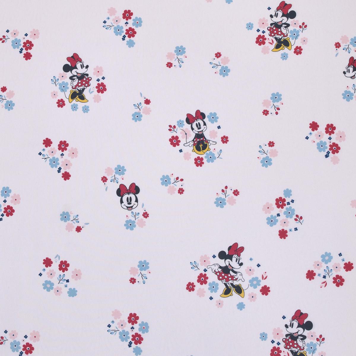 Add springtime bouquets to your nursery with the Disney Minnie Mouse floral mini fitted crib sheet. Features Minnie Mouse among beautiful floral bouquets with flowers in shades of pink, blue, bright pink, and white. Includes full elastic edges for a safe and snug fit. Fits a standard-size mini crib mattress.