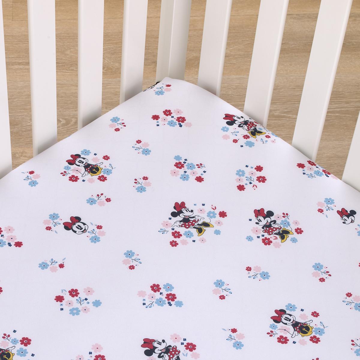 Description Add springtime bouquets to your nursery with the Disney Minnie Mouse floral mini fitted crib sheet. Features Minnie Mouse among beautiful floral bouquets with flowers...