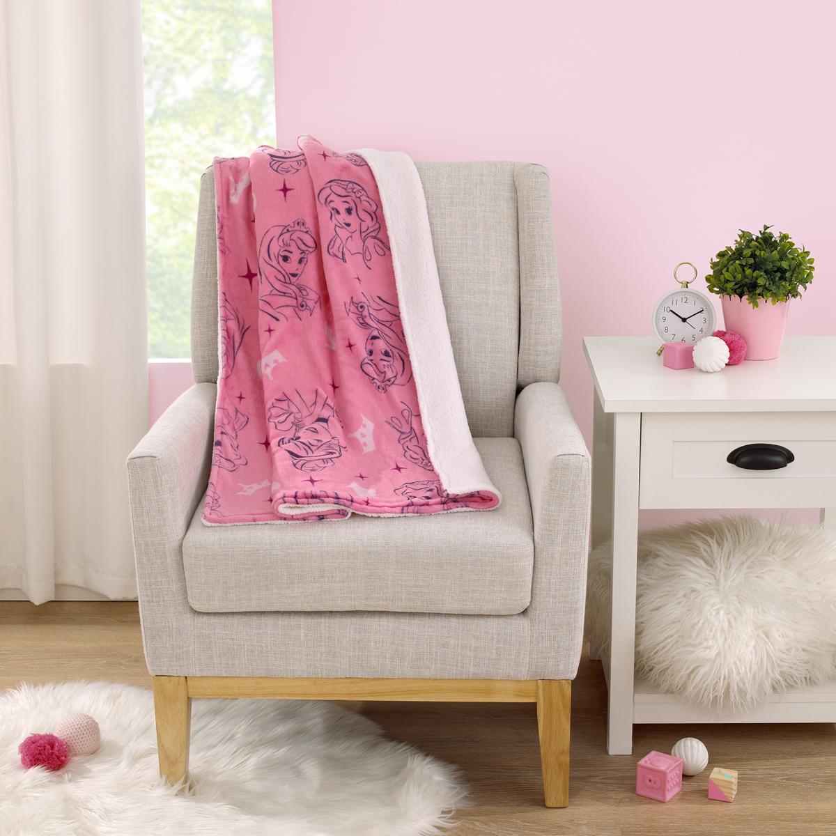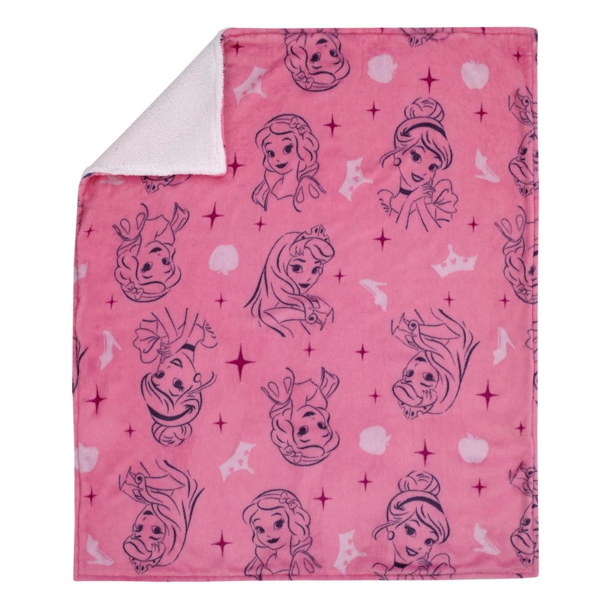 Description This Disney Princesses baby blanket makes a wonderful gift. Features the Princesses Cinderella, Aroura, and Snow White with tiaras, apples, and glass slippers. The...