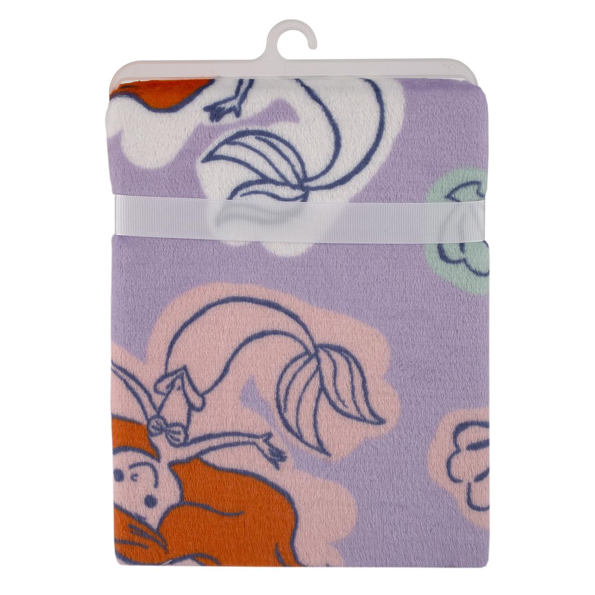 Ariel is Princess of the Seas on this Disney The Little Mermaid baby blanket. Features Ariel swimming among the seashells in shades of lavender, orange, aqua, pink and white. It is the perfect size for cuddling, use in the stroller, travel in the car, and great for babies and moms on the go!