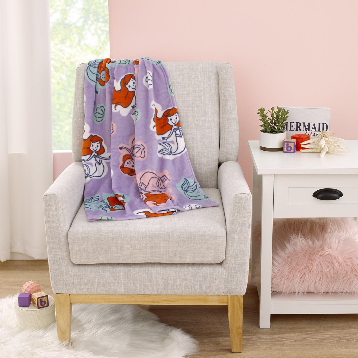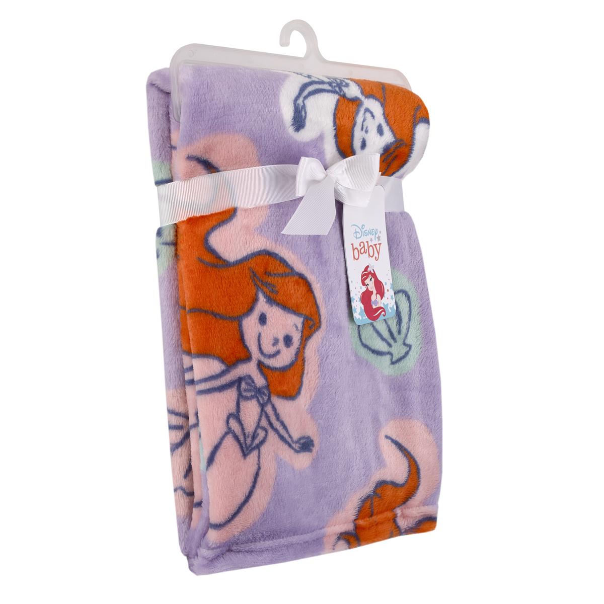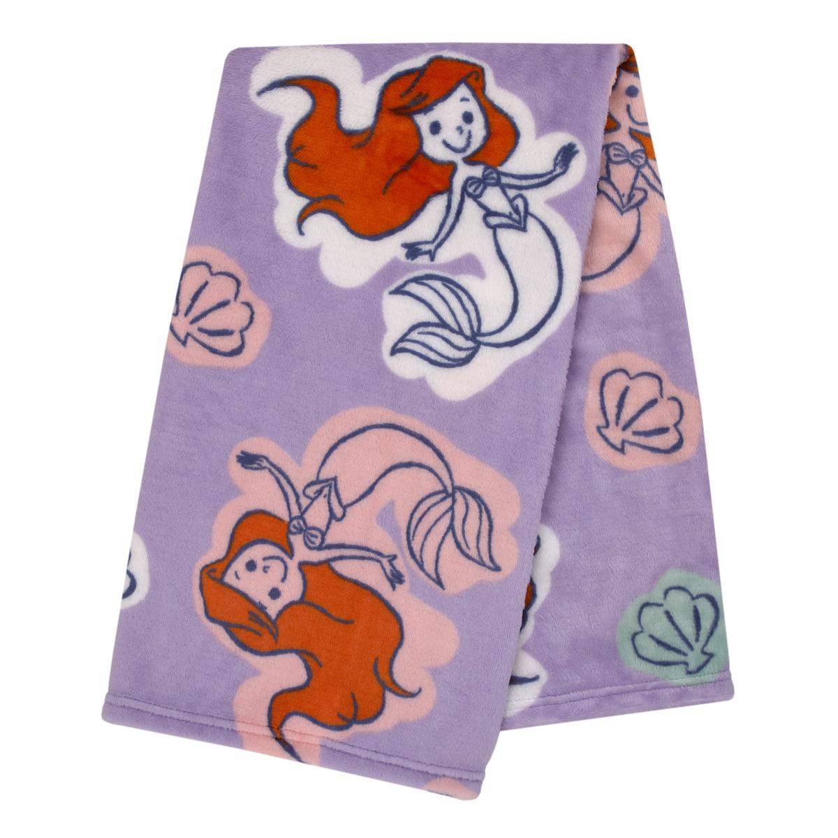 Description Ariel is Princess of the Seas on this Disney The Little Mermaid baby blanket. Features Ariel swimming among the seashells in shades of lavender, orange, aqua, pink...