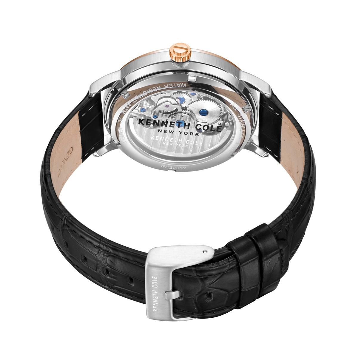 This Mens Kenneth Cole® New York skeleton automatic watch features a two-tone rose gold and silver-tone 43mm case. The inner workings of this automatic movement are highlighted with a black outer dial with rose gold hour markers. The watch is complimented with a black genuine leather strap and an anti-glare crystal.