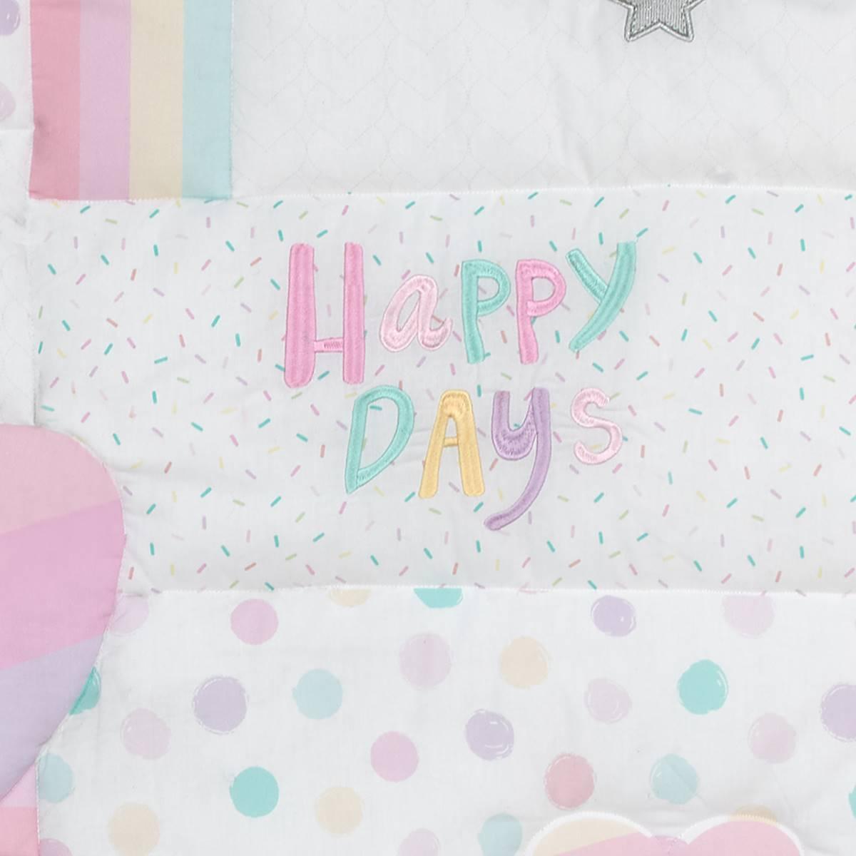 Let the sunshine in with the NoJo Happy Days 4-piece crib set! The cheerful comforter features a bright sun, moon, and stars with rainbows, clouds, and hearts detailed! The crib sheet has full elastic edges for a safe and snug fit and is featured in a colorful print with bright suns, rainbows, and bold polka dots! The pretty pink crib skirt is made of shirred organza fabrics with a 14-inch drop length. Keep your nursery tidy with the handy matching reversible storage bin in solid pink with multi-colored rainbow lining.