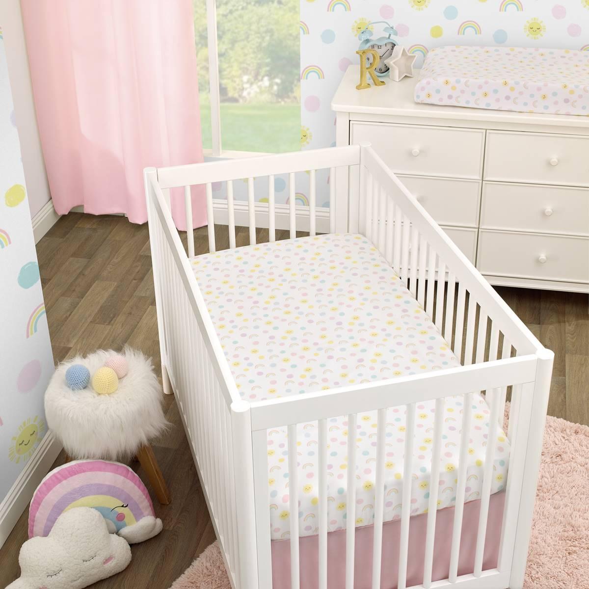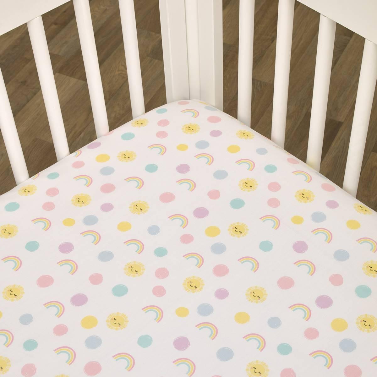 This NoJo Happy Days fitted crib sheet is perfect for your little one. Features a white ground with yellow suns, and multi-colored rainbows with bold polka-dots in pink, lavender, blue, and yellow. It is fully elasticized for a safe and snug fit and fits a standard-size crib/toddler mattress.
