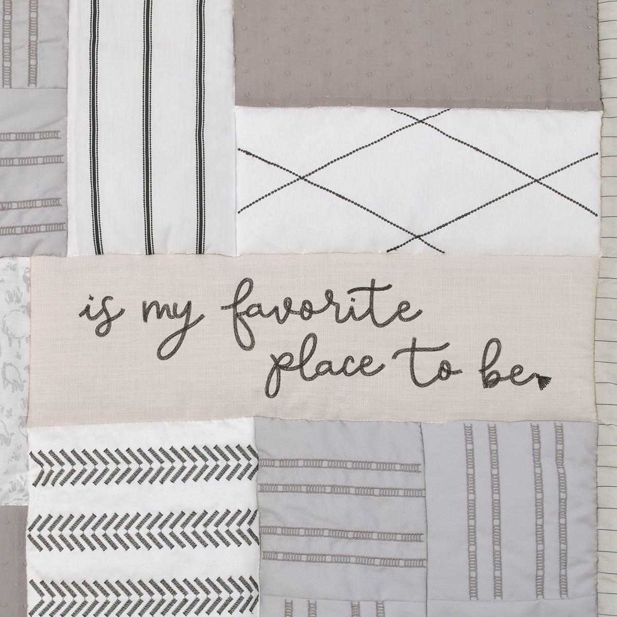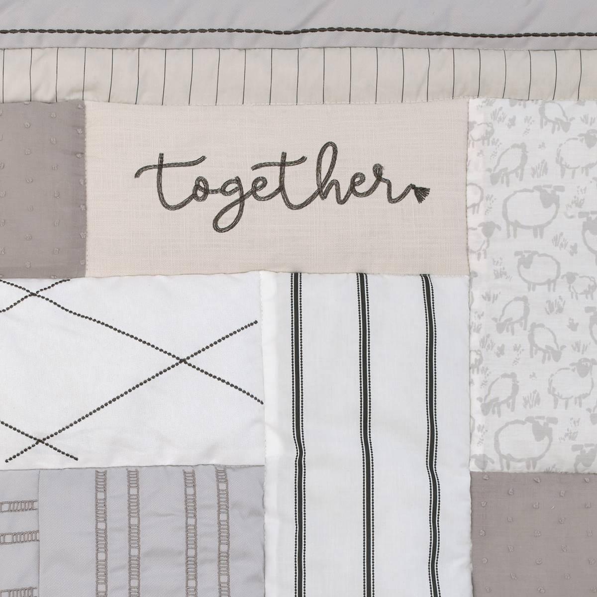 This NoJo Together is Better 4-piece crib bedding set shows why it´s always better when we´re together! The comforter features homespun embroideries with an endearing affirmation, "Together is My Favorite Place To Be". The crib sheet features elastic all around the edges for a safe and snug fit. The crib skirt is a solid taupe made to look like real linen and features embroidered tassels as trim for the long front panel. The reversible storage coordinates with the fitted sheet.