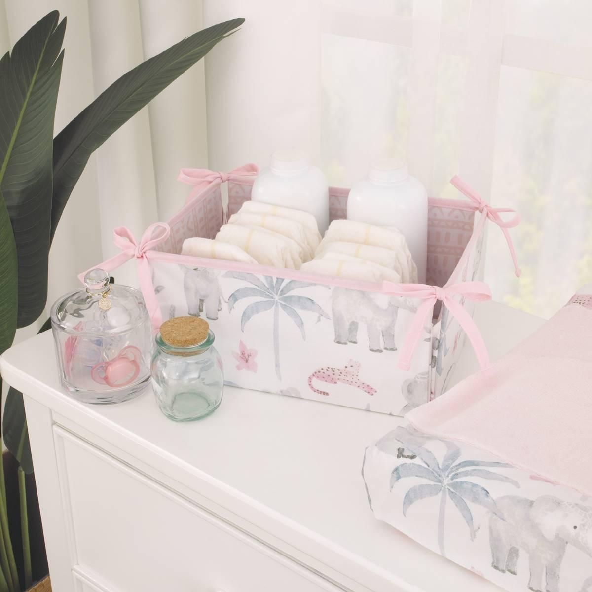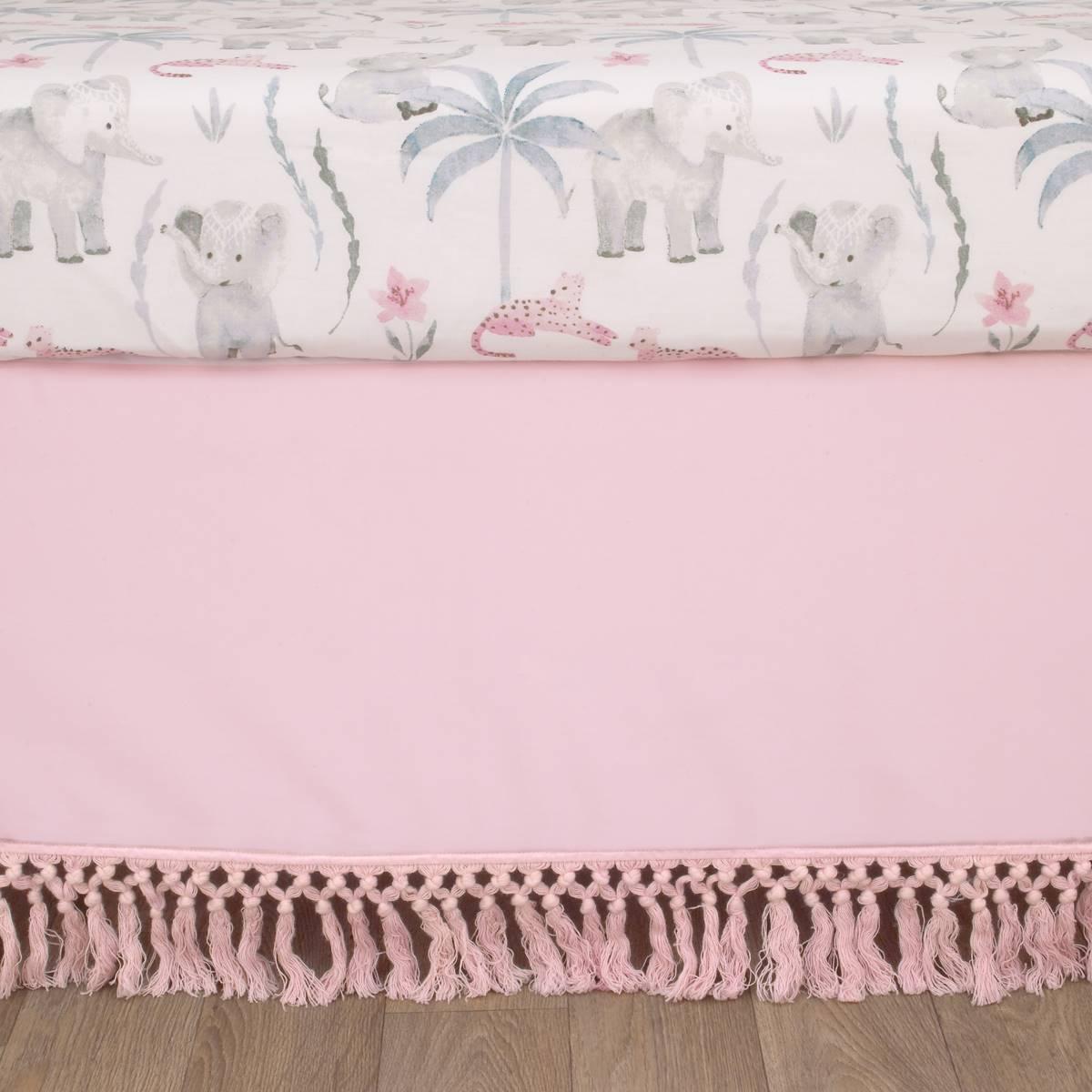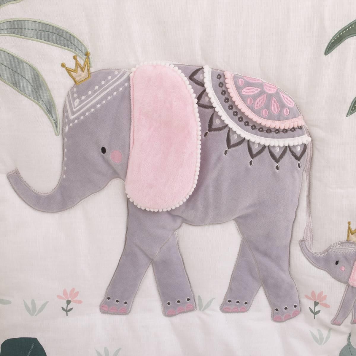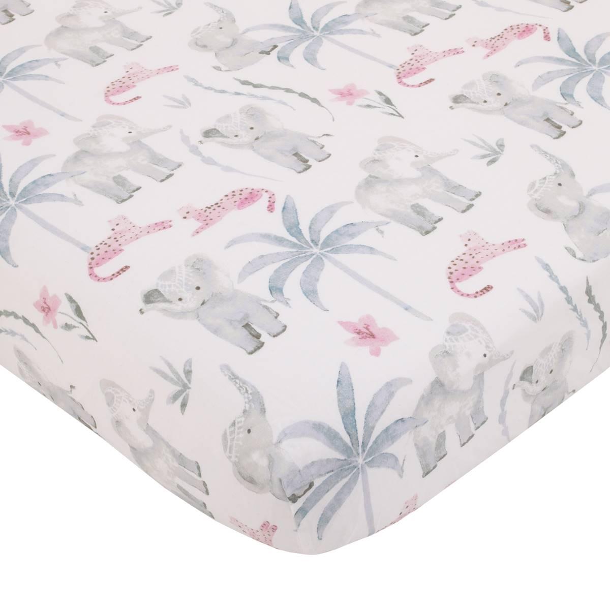 Turn your little girl’s nursery into a tropical paradise with this NoJo Tropical Princess 4-piece crib bedding set. It has everything you need to transform your little girl’s crib into topical fun with adorable palms and elephants. She will sleep surrounded by tropical flowers, palm trees, and elephants. The crib set includes a comforter, crib sheet, dust ruffle, and storage organizer.