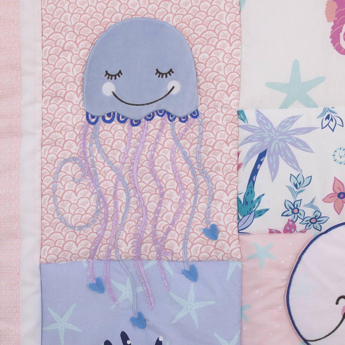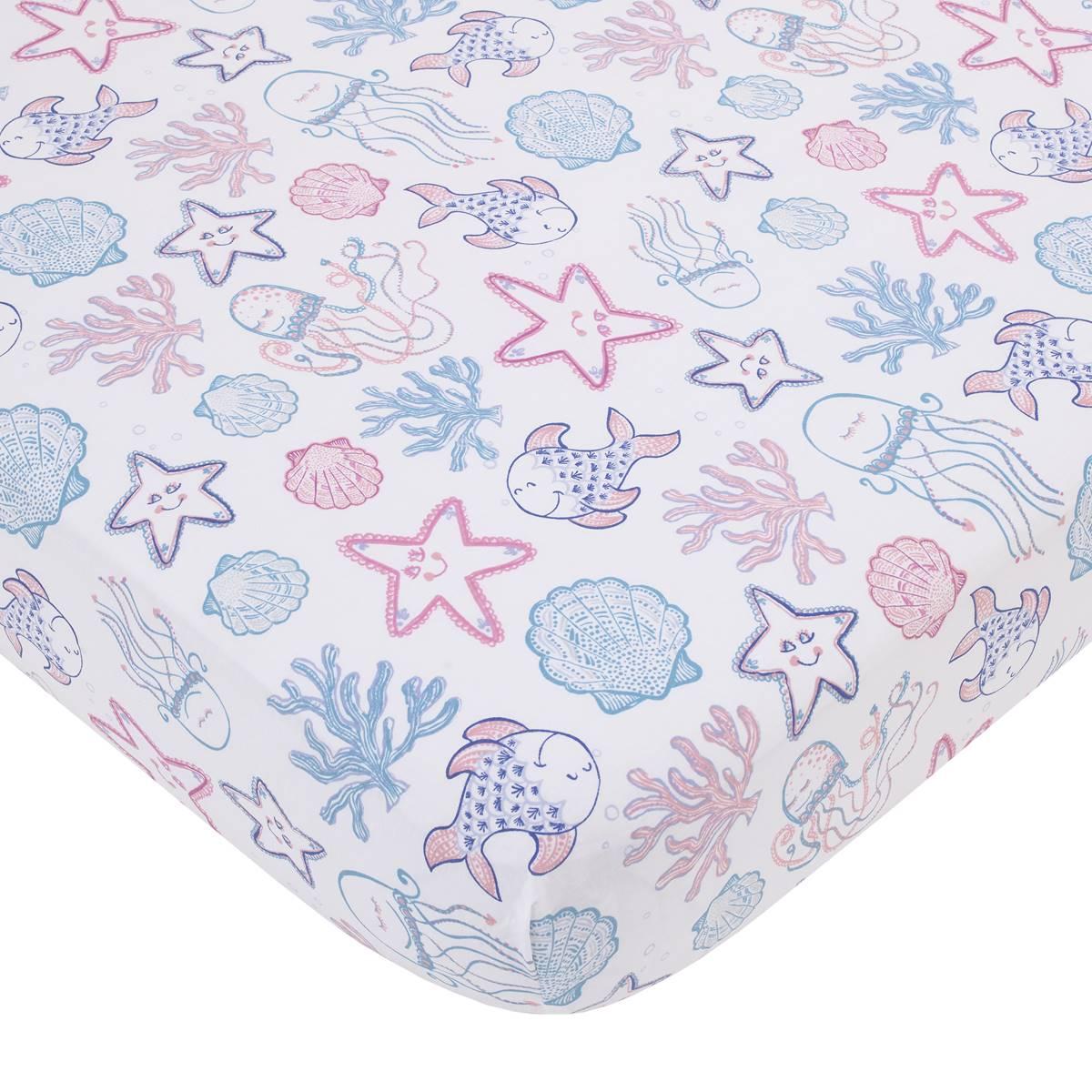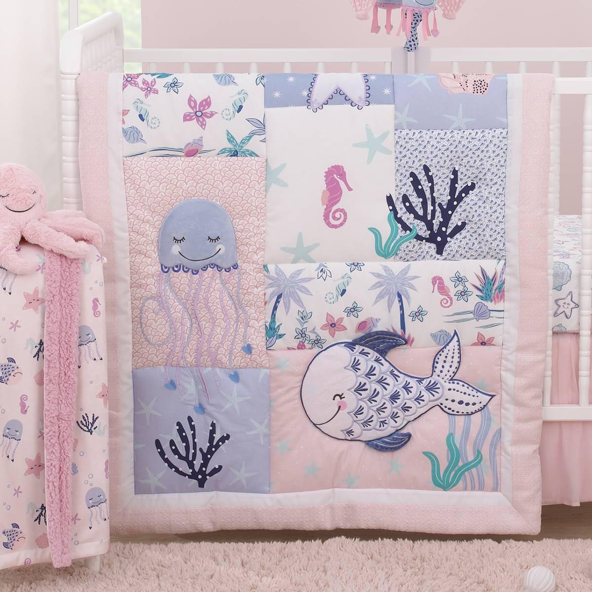 Come with me to the sea with this NoJo Mermaid Lagoon 4-piece crib bedding set. Includes a comforter, fitted crib sheet, crib skirt, and storage caddy. The comforter features various sea friends, jellyfish, starfish, seashells, and coral, with allover sea friends printed back. The fitted crib sheet is a playful assorted sea friends pattern in shades of pink, blue, aqua, white, and a touch of navy. The crib skirt is solid soft pink with a sheer gathered overlay and 14-inch drop length. The storage caddy is reversible to an allover sea friends pattern or solid pink.