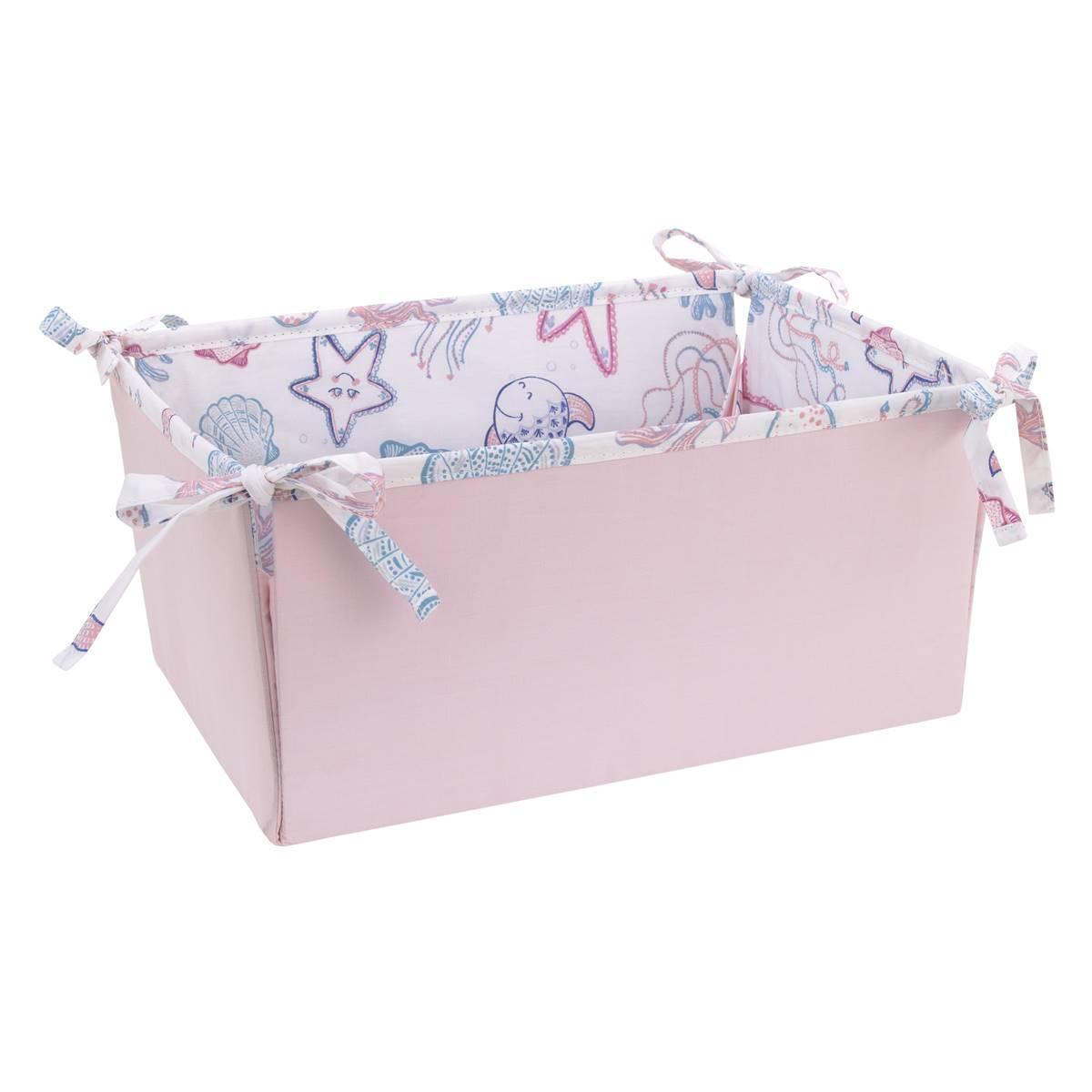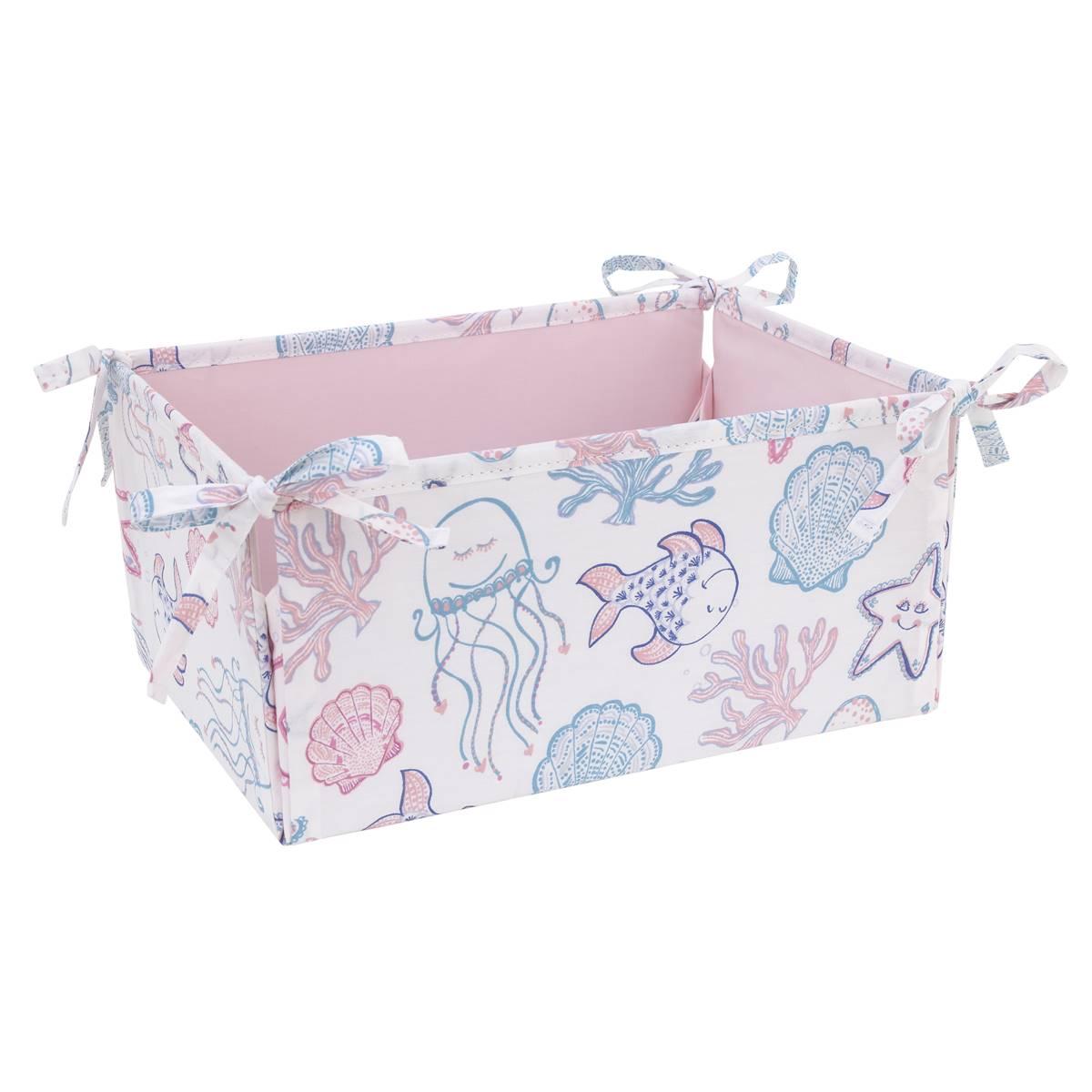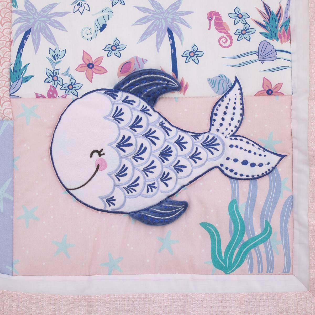 Come with me to the sea with this NoJo Mermaid Lagoon 4-piece crib bedding set. Includes a comforter, fitted crib sheet, crib skirt, and storage caddy. The comforter features various sea friends, jellyfish, starfish, seashells, and coral, with allover sea friends printed back. The fitted crib sheet is a playful assorted sea friends pattern in shades of pink, blue, aqua, white, and a touch of navy. The crib skirt is solid soft pink with a sheer gathered overlay and 14-inch drop length. The storage caddy is reversible to an allover sea friends pattern or solid pink.