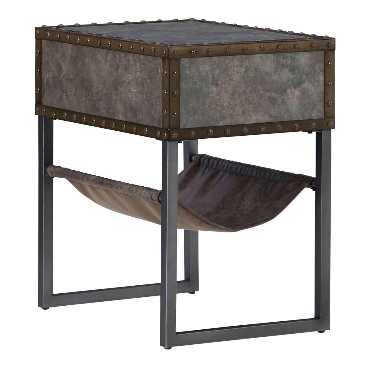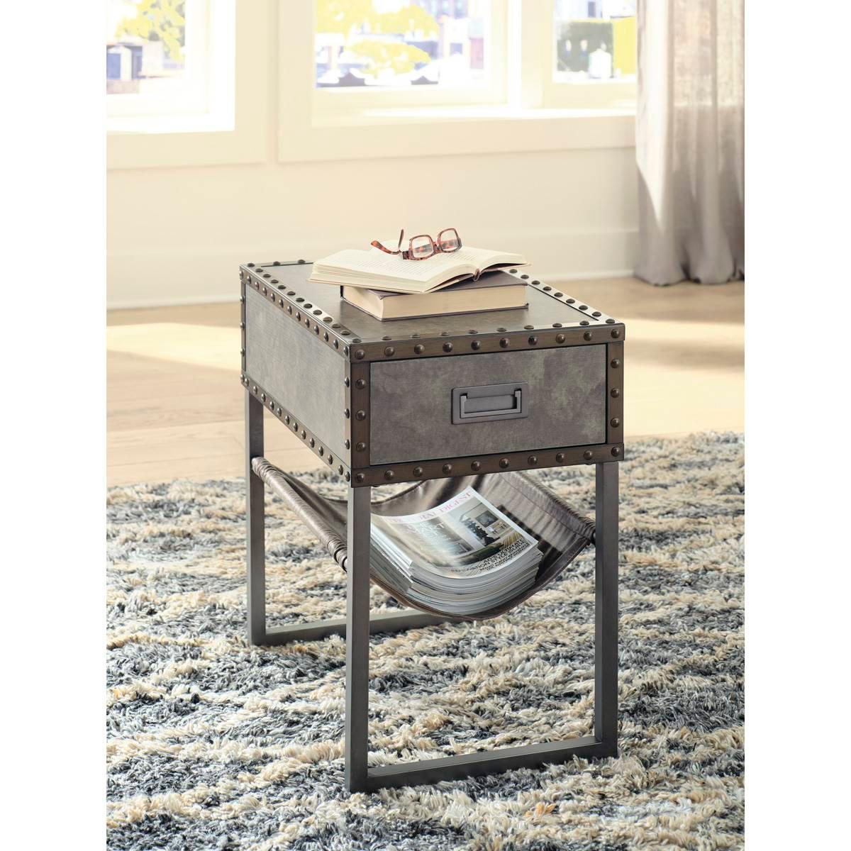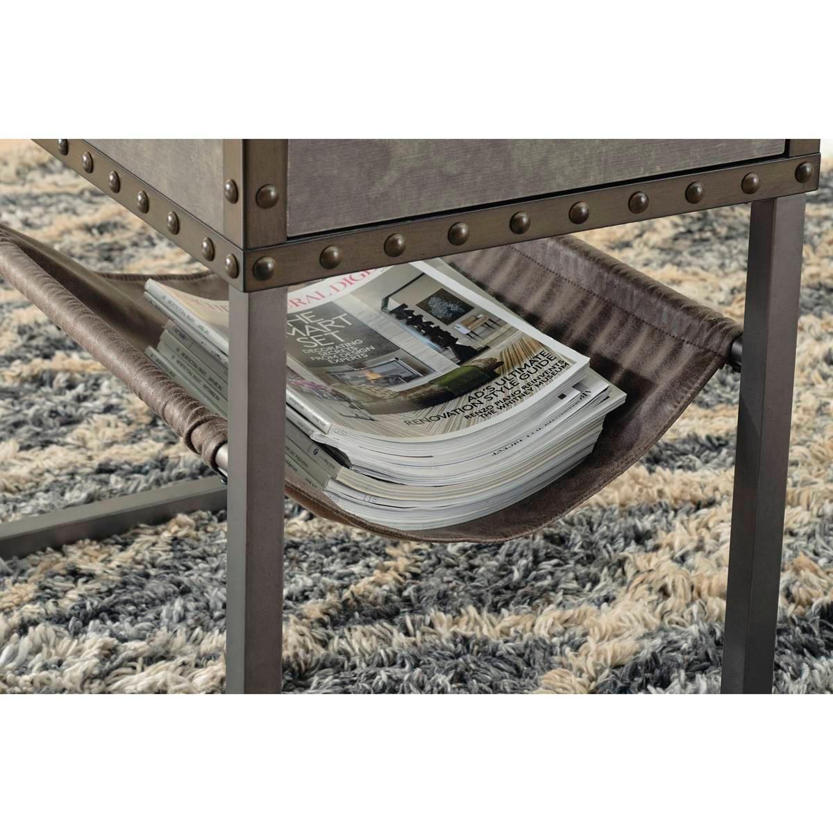 Reinvented for the here and now, the Signature Design by Ashley Derrylin chairside end table rocks vintage industrial design with a traditional vibe. Its metal accent trim and bronze-tone metal base are ready to embrace the modern demands of everyday life. A drawer with a fully finished interior provides additional storage, while the faux leather hanging basket keeps your books and magazines within easy reach.