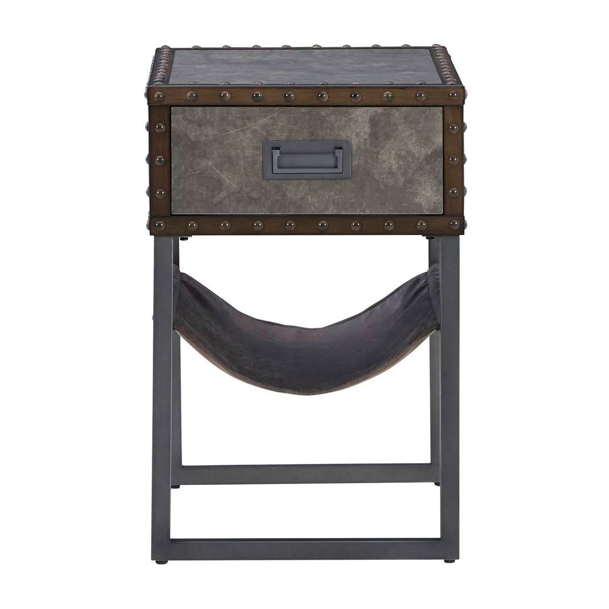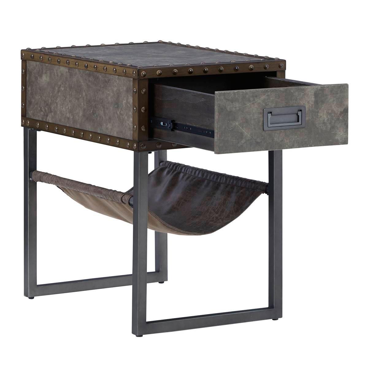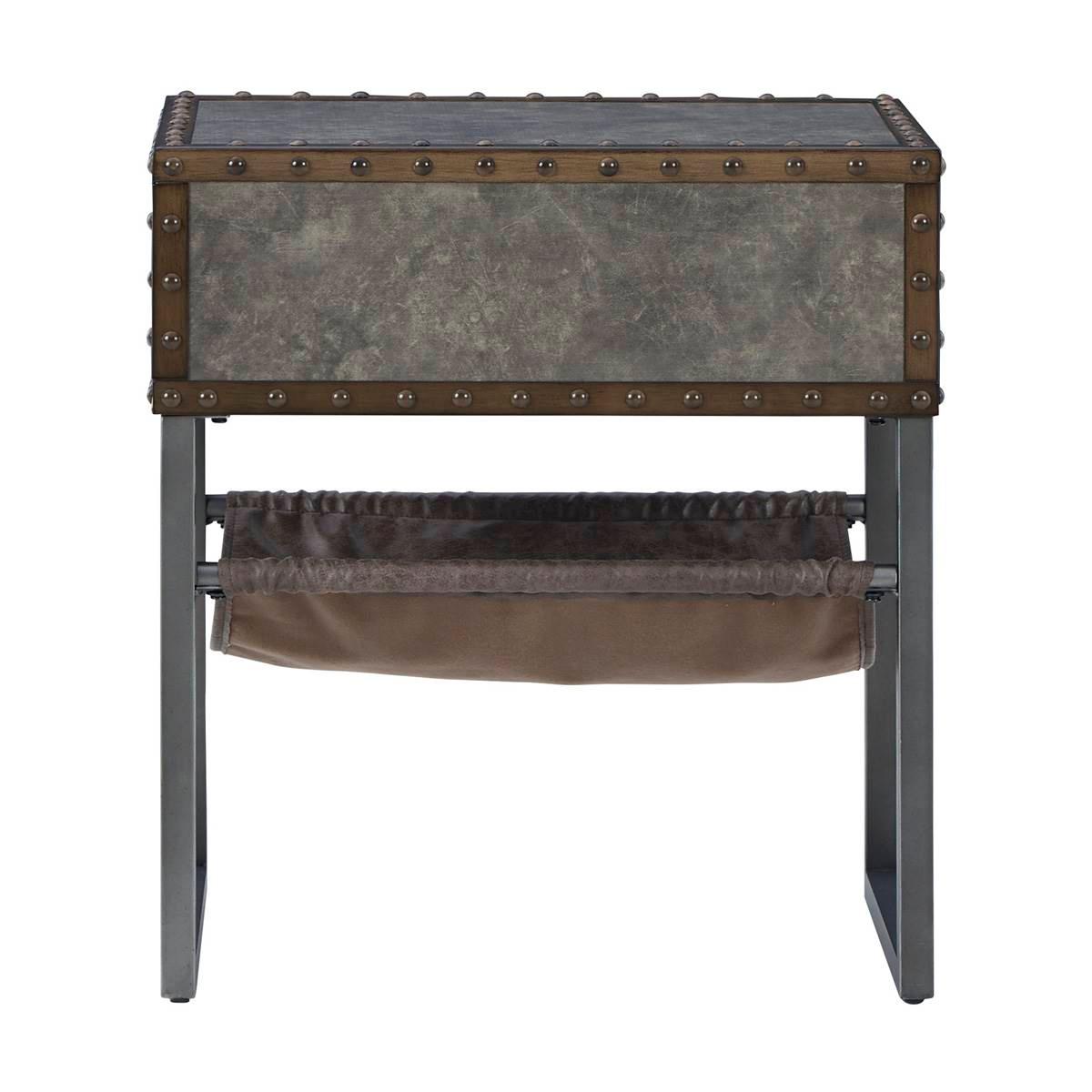 Reinvented for the here and now, the Signature Design by Ashley Derrylin chairside end table rocks vintage industrial design with a traditional vibe. Its metal accent trim and bronze-tone metal base are ready to embrace the modern demands of everyday life. A drawer with a fully finished interior provides additional storage, while the faux leather hanging basket keeps your books and magazines within easy reach.