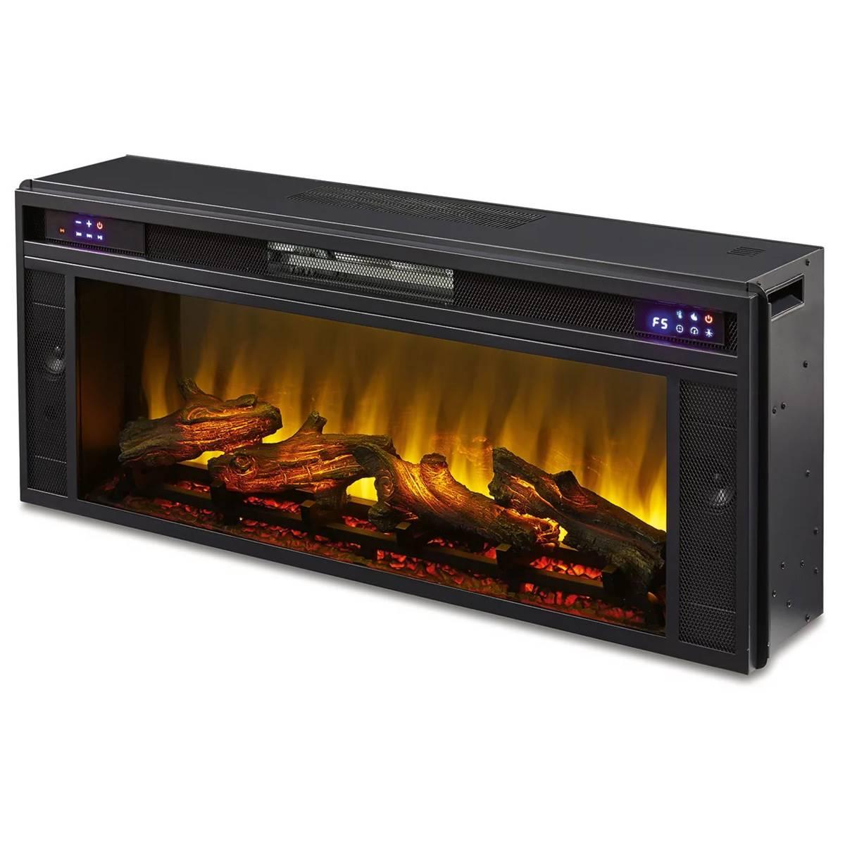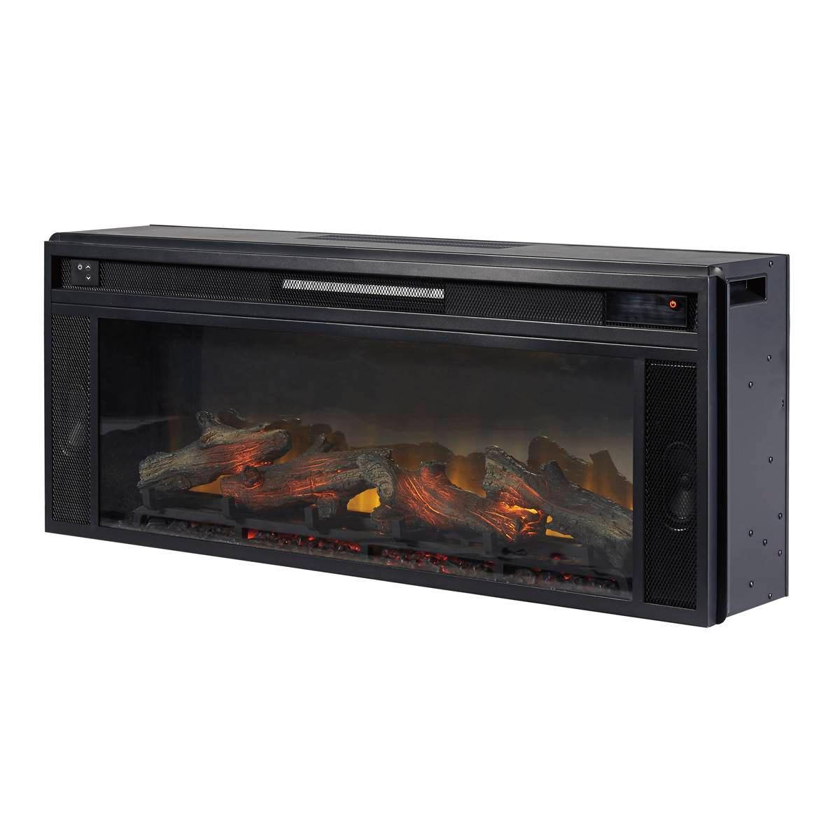 Add a touch of warmth and create a beautiful ambiance for your TV viewing pleasure with this Signature Design by Ashley fireplace insert. Available as an addition to select TV stands and entertainment centers, this insert can easily replace a lower shelf in your entertainment center. With no hassle, maintenance, or cleanup, delight in all the unique features of this fireplace via remote control. With the touch of a button, adjust flame brightness levels, and temperature or connect your Bluetooth device to the built-in speakers. The flame effect includes a realistic-looking log set with glowing embers and an ambient downlight.