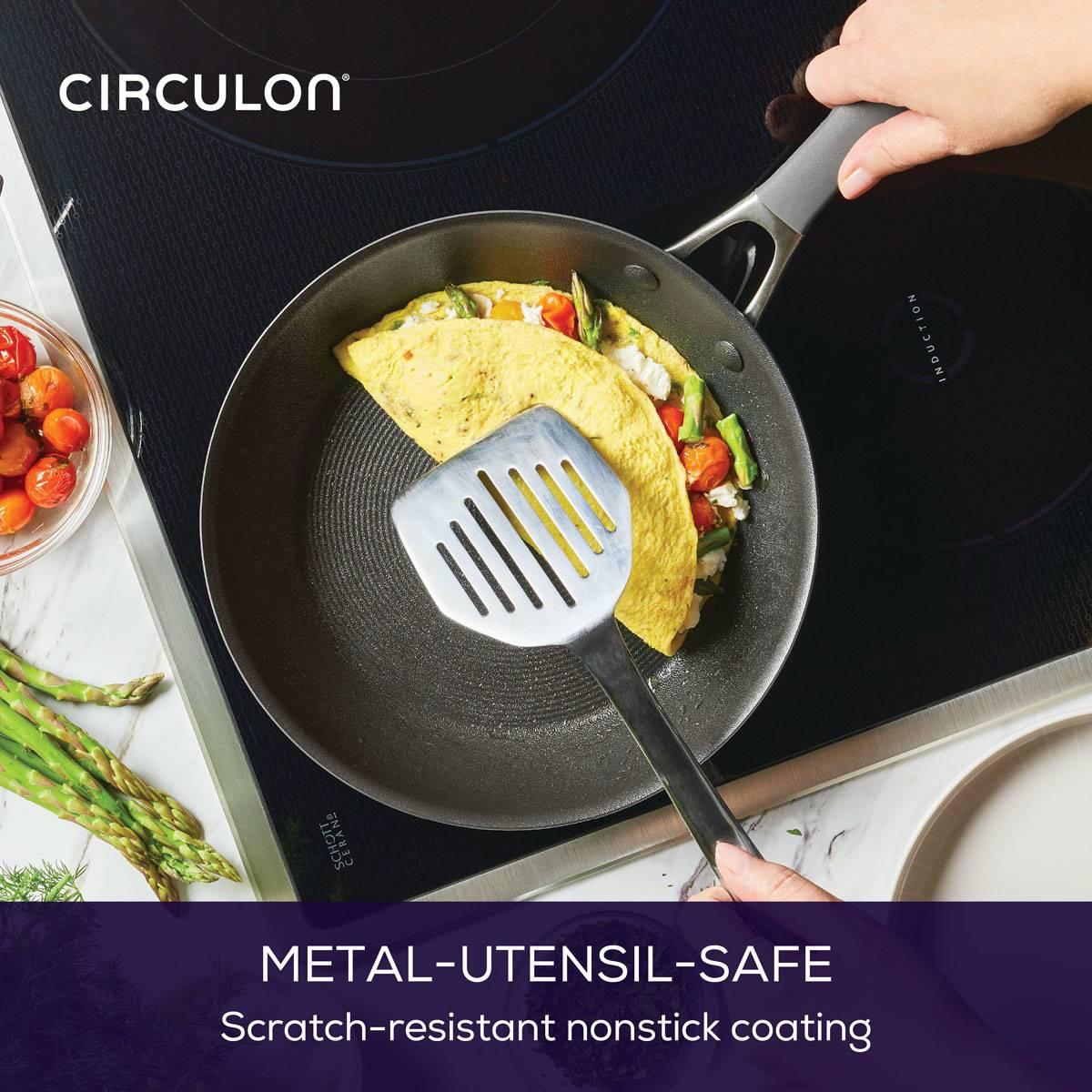 From the inventors of hard-anodized nonstick cookware comes the Circulon A1 Series induction 10-inch frying pan with ScratchDefense™ technology. With durable aerospace-grade materials, it creates a thicker and harder surface than ordinary nonstick which will eliminate scratching, sticking, and flaking. Cook with complete confidence using this dishwasher-safe frying pan with a triple-layer nonstick cooking surface that lasts 130X longer than the competition. This performance-primed and feature-forward nonstick skillet is dishwasher safe, oven safe to 400°F, and built with an aluminum core for fast, all-over heat delivery and a thick, induction-suitable stainless steel base to boost durability and heat retention. Pioneering technology. Extreme durability. Flawless performance. The Circulon A1 Series with ScratchDefense™ technology is complete toughness and re-engineered for total cooking confidence.